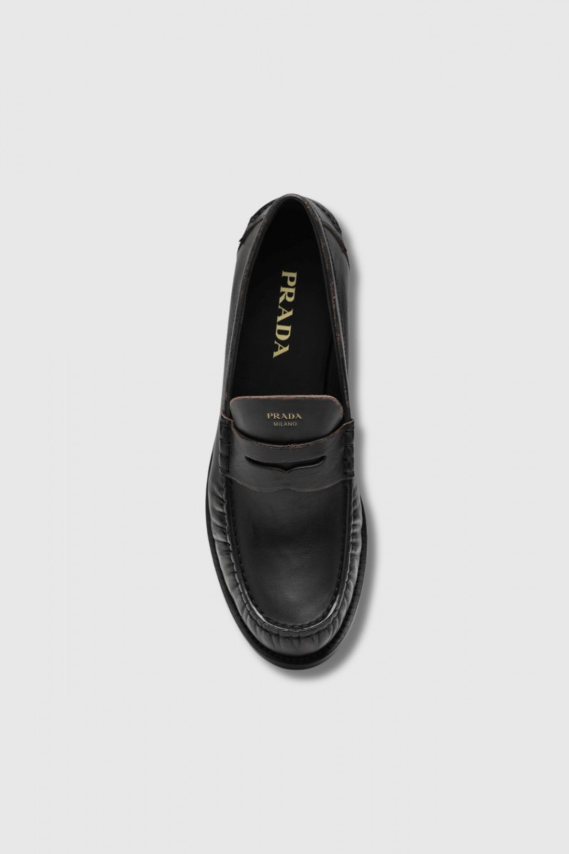 Ces mocassins en cuir vieilli noir signés Prada incarnent une élégance contemporaine au caractère affirmé. Confectionnés en cuir brossé à l’aspect patiné, ils sont sublimés par un mors en cuir sur l’empeigne et un logo imprimé discret. La semelle monobloc en caoutchouc, rehaussée d’un logo embossé, apporte une touche moderne et assure confort et stabilité, faisant de ce modèle une pièce sophistiquée et résolument urbaine.