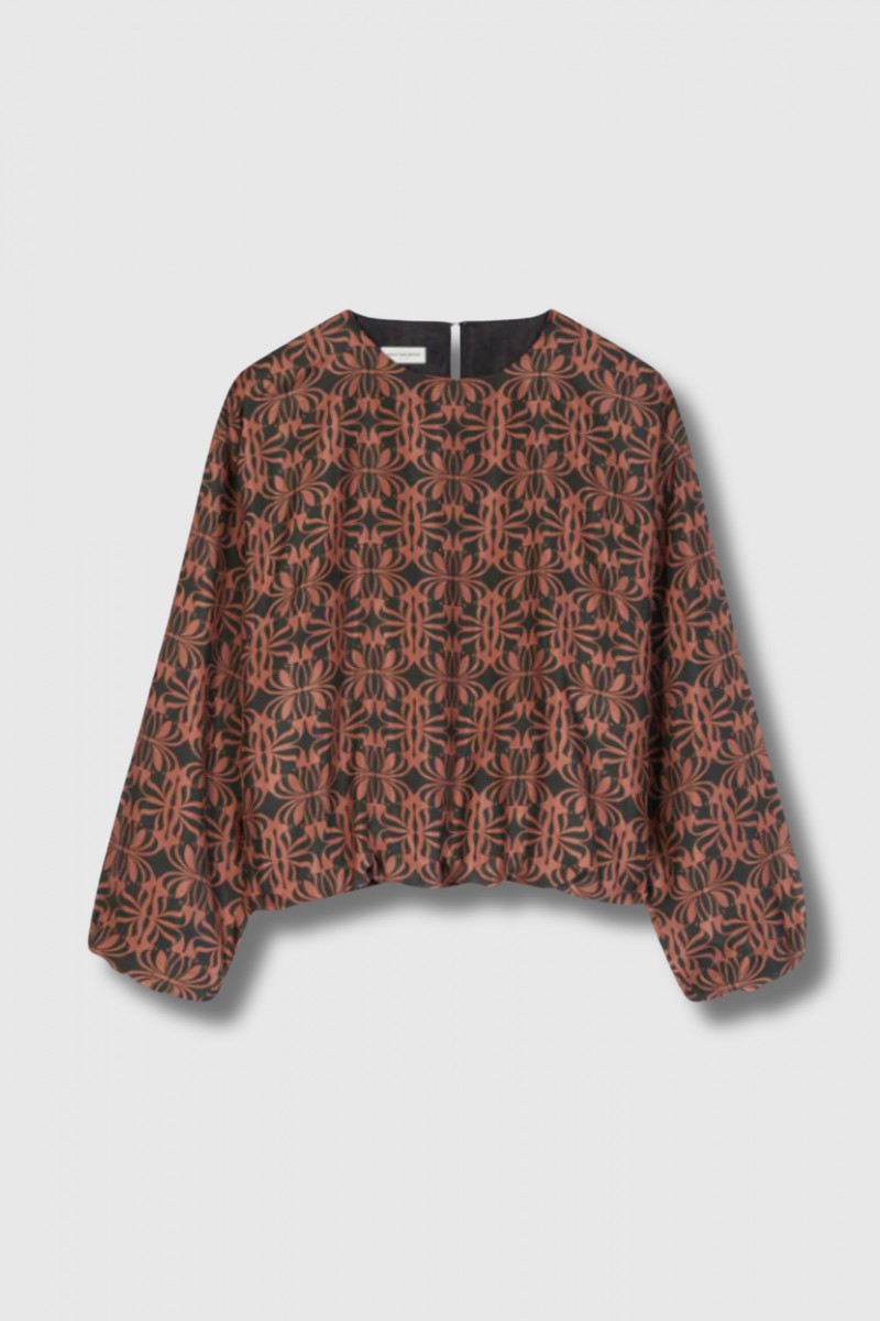 Ce top en soie imprimée fleur noir et bordeaux est signé Dries Van Noten. Celui-ci possède un col ras de cou, une coupe oversize et des manches bouffantes. Cette pièce possède un élastique à la taille.