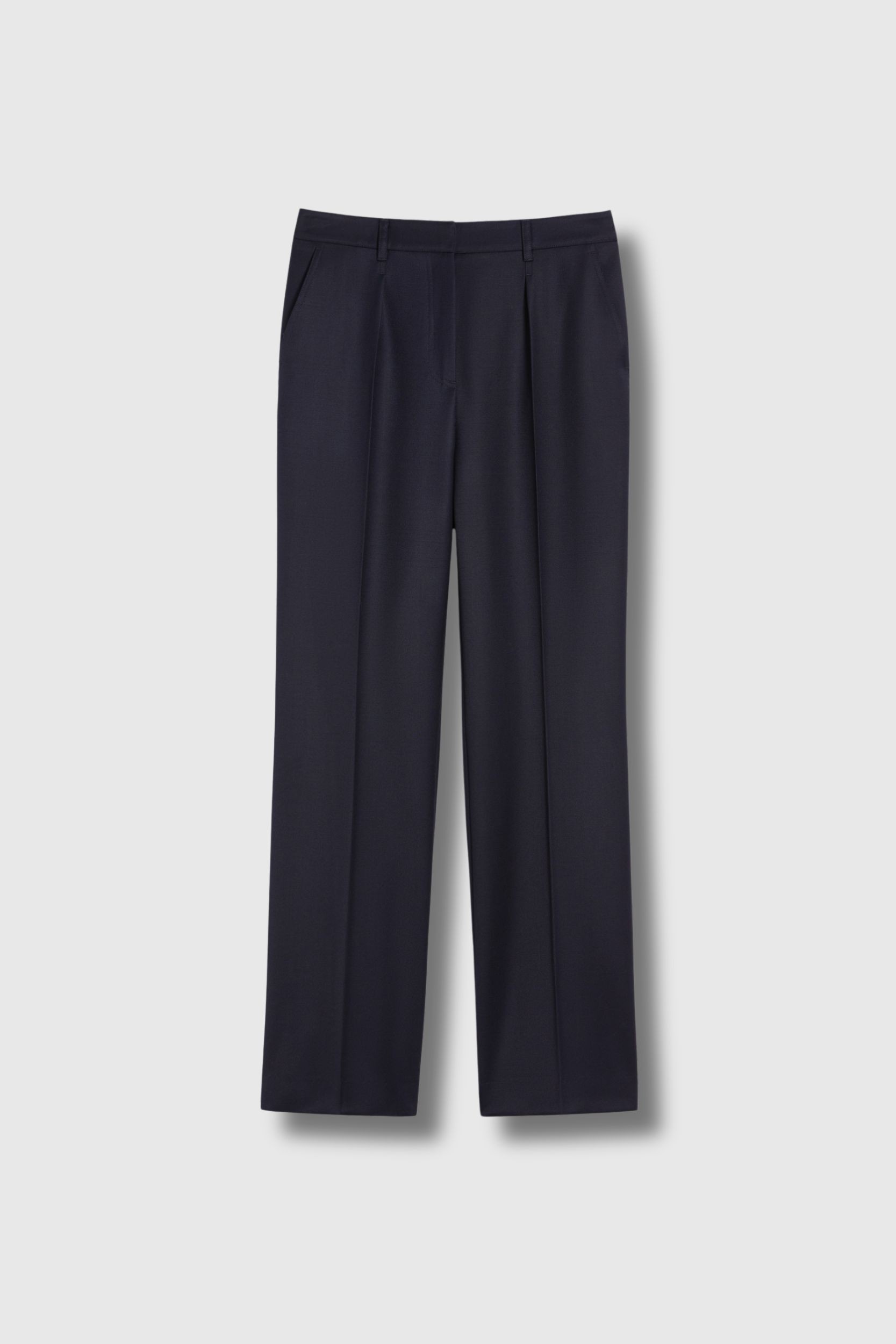 Ce pantalon en gabardine de laine bleu marine signé MaxMara allie élégance masculine et confort contemporain. Confectionné en gabardine de pure laine, il arbore une coupe droite avec deux pinces à l’avant, une taille haute avec fermeture zippée et petit crochet, ainsi que des poches italiennes sur les côtés et passepoilées au dos. Le pli marqué et les passants de ceinture soulignent la silhouette, tandis que l’étiquette en cuir à la taille apporte la signature raffinée de la maison.