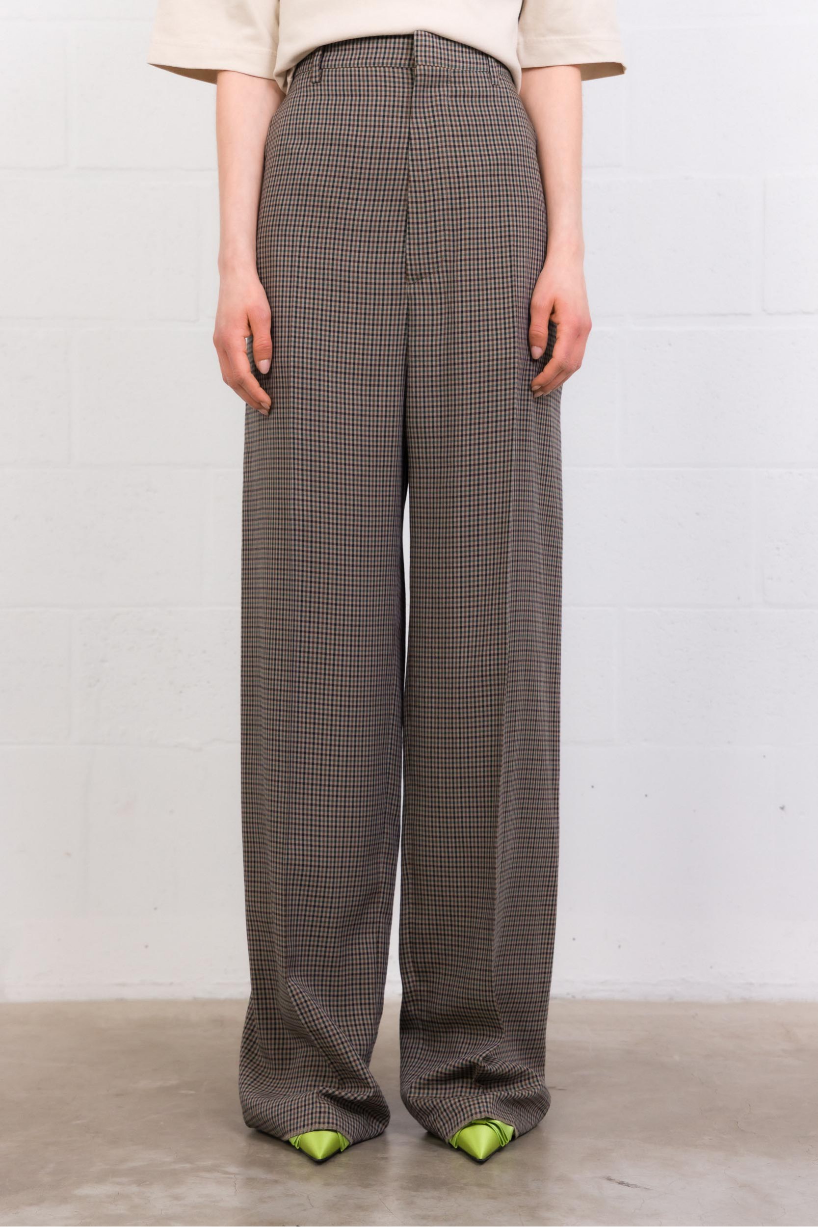Ce pantalon à carreaux marron-kaki signé Balenciaga est confectionné en lyocell fluide au tombé élégant, rehaussé d’un motif check subtil. Sa taille mi-haute et sa braguette zippée dissimulée offrent une ligne épurée, complétée par six passants de ceinture pour un porté parfaitement ajusté. Deux poches fendues à l’avant et une poche passepoilée à l’arrière structurent la silhouette, tandis qu’un pli marqué sur la jambe apporte une touche tailoring sophistiquée, fidèle à l’esthétique contemporaine de la Maison.
