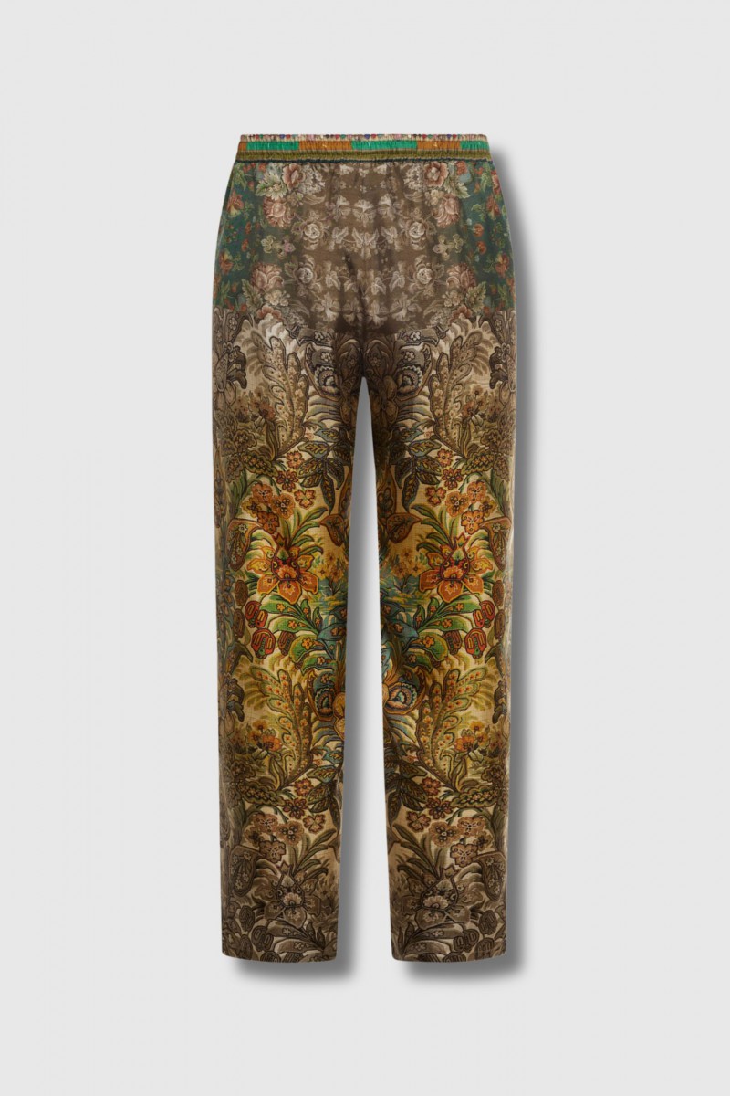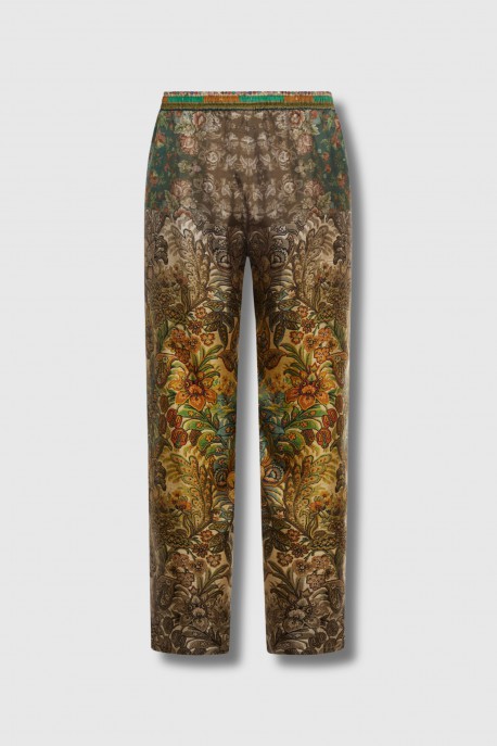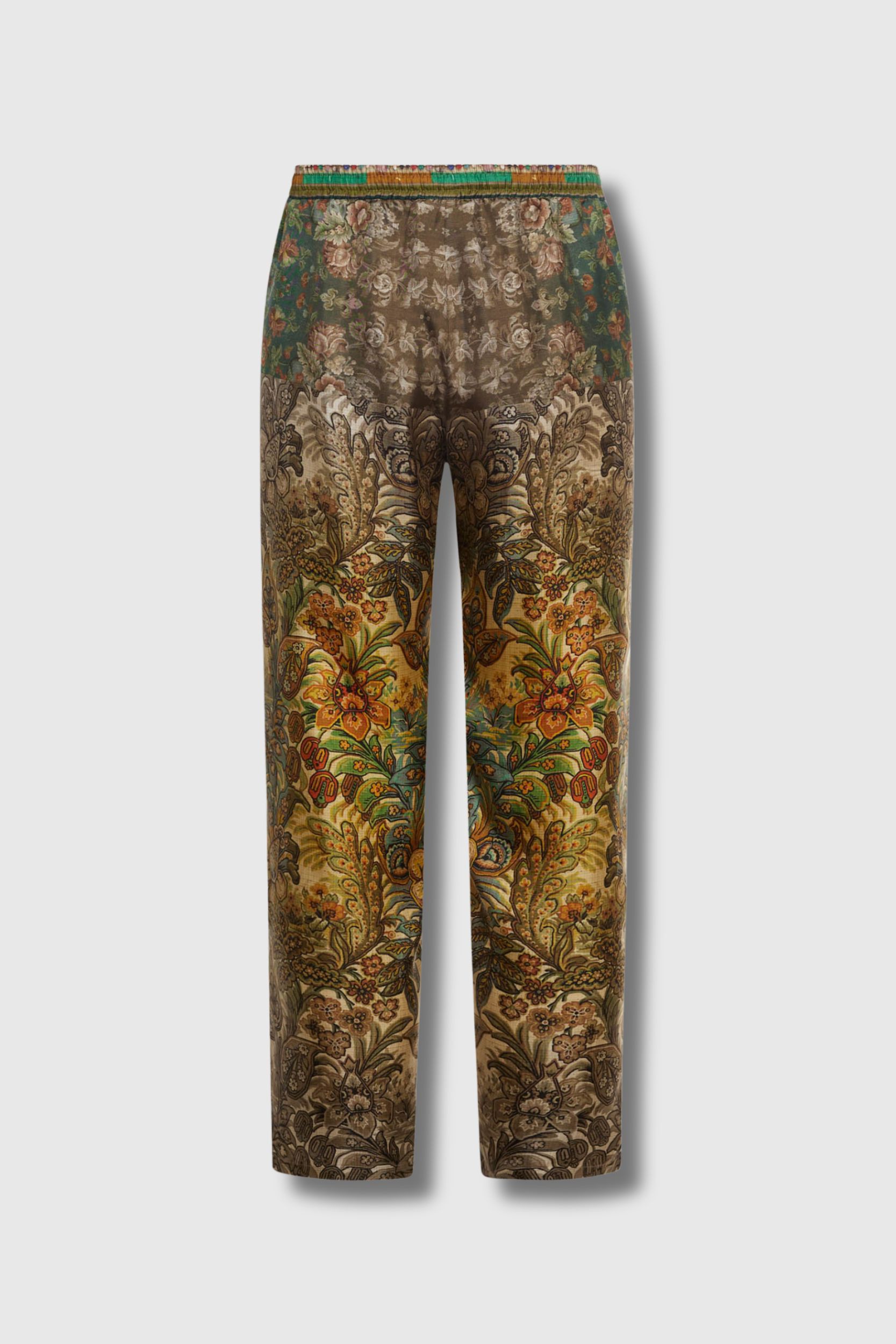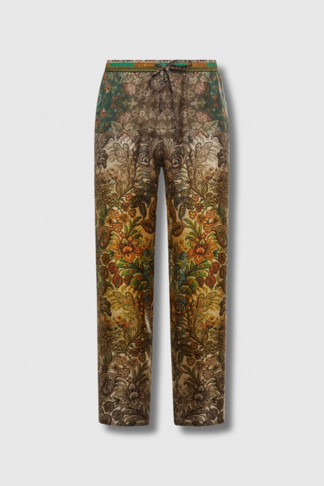 Ce pantalon en soie signé Pierre Louis Mascia séduit par sa coupe à jambe droite et sa somptueuse tapisserie botanique déclinée dans une palette de verts profonds et de bruns terreux. Véritable récit visuel, son motif riche et ornemental évoque une élégance intemporelle et invite à des jeux de superpositions raffinés. À porter avec un chemisier en soie épuré pour laisser pleinement s’exprimer la puissance décorative de la pièce.