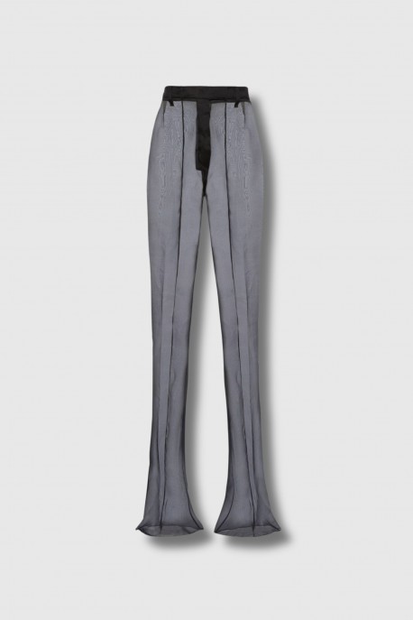 Ce pantalon en soie noir est signé Prada. Il est réalisé en soie organza fluide et semi-transparente et présente une coupe évasée. Ce pantalon est accompagné d'un short "doublure" en soie noir.