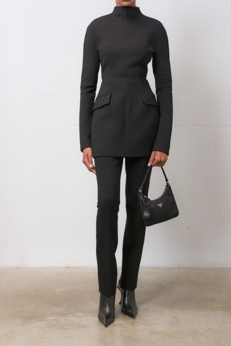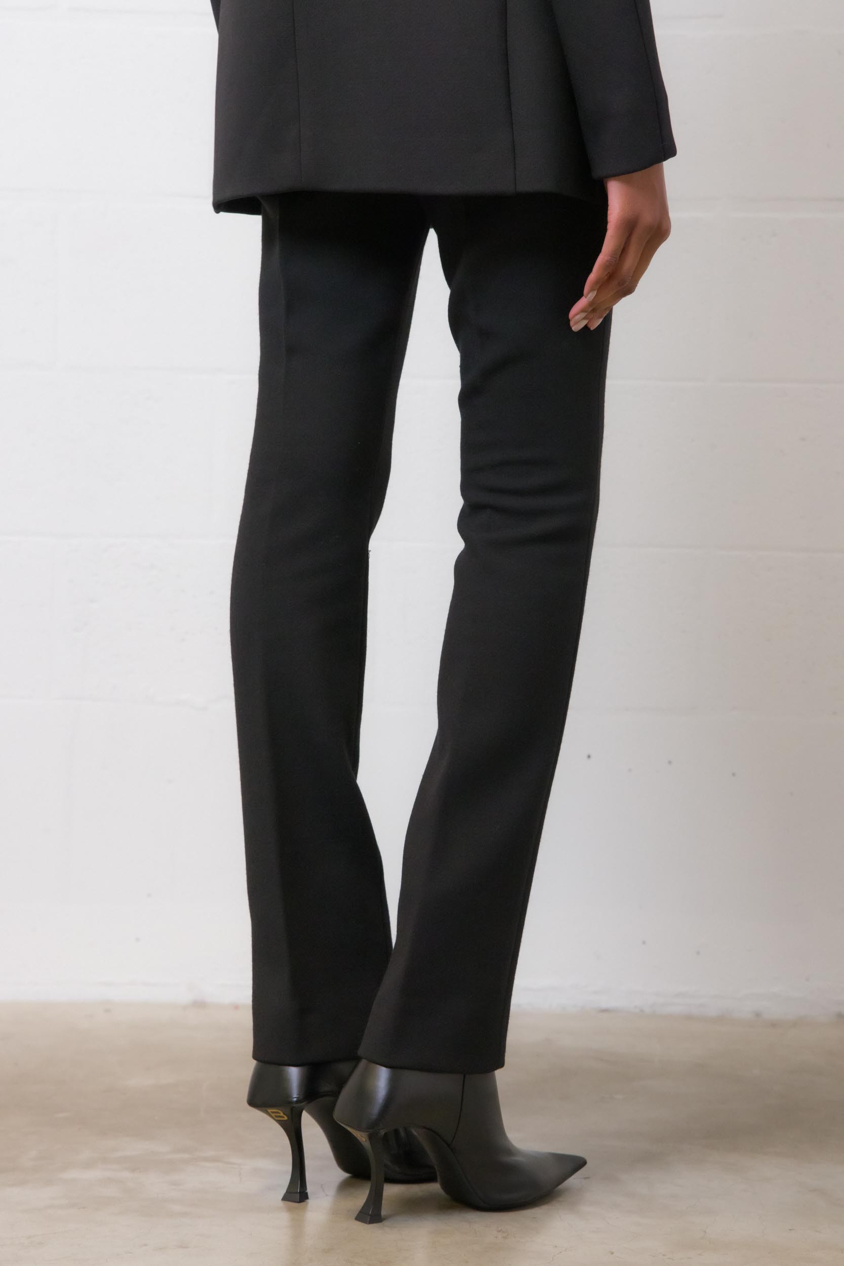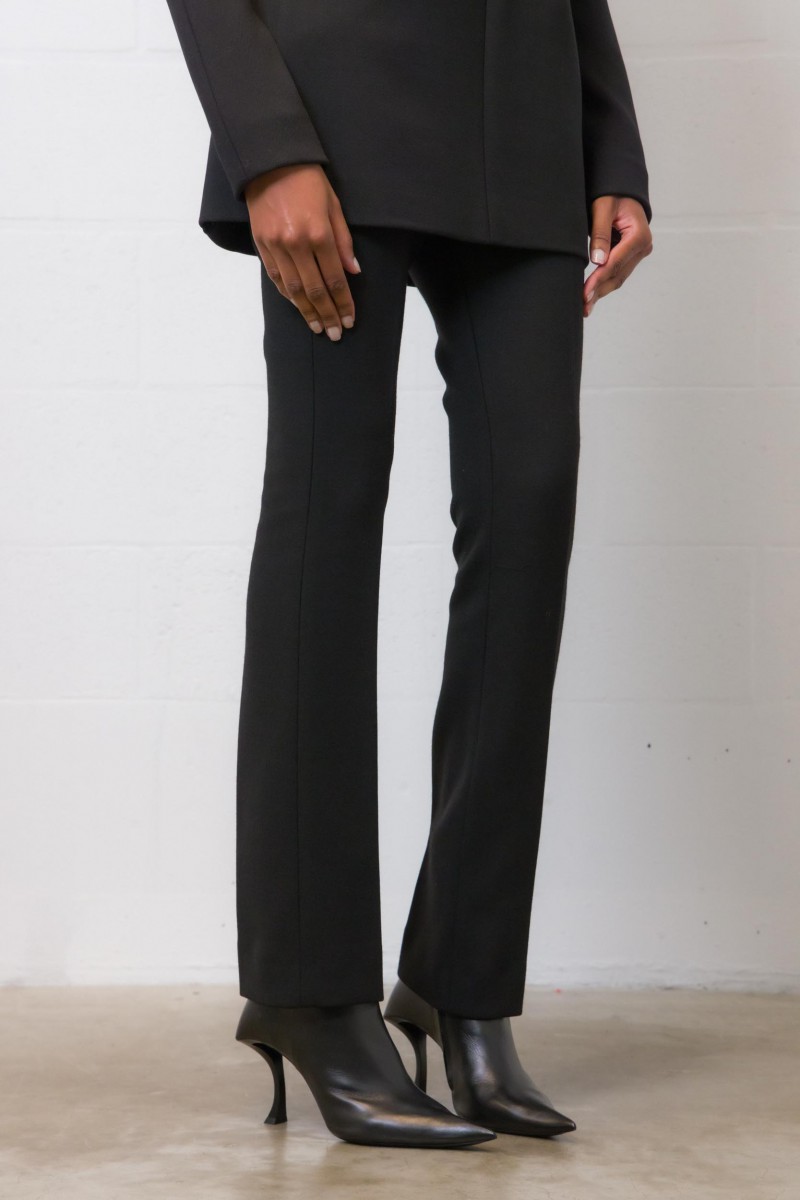 Ce pantalon noir en gabardine de laine stretch épaisse est signé SportMax. Il offre une coupe droite avec des plis repassés à l'avant et à l'arrière, créant ainsi une silhouette élancée. La fermeture éclair est discrètement placée au dos.