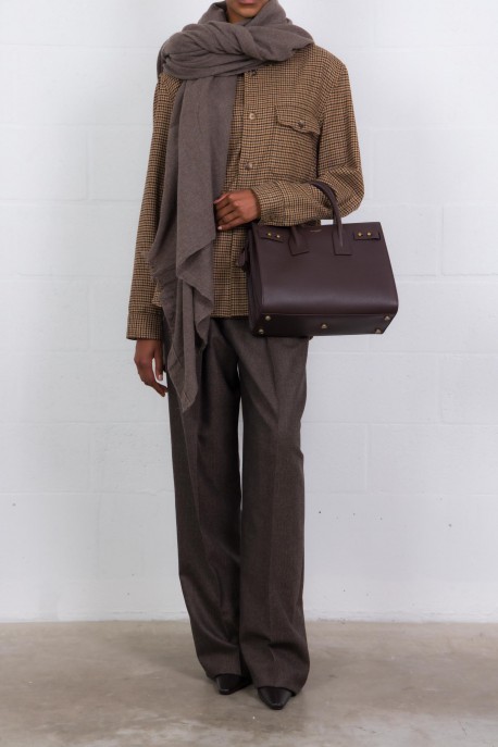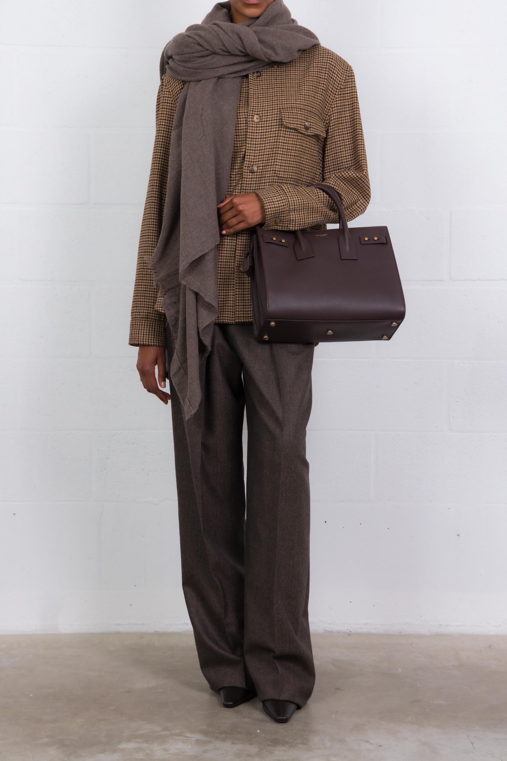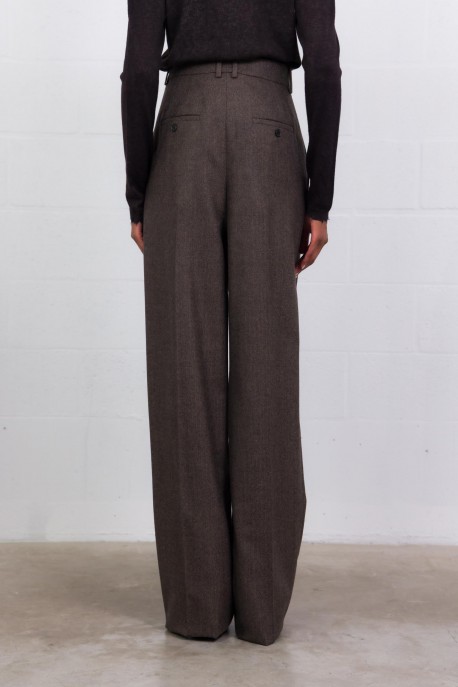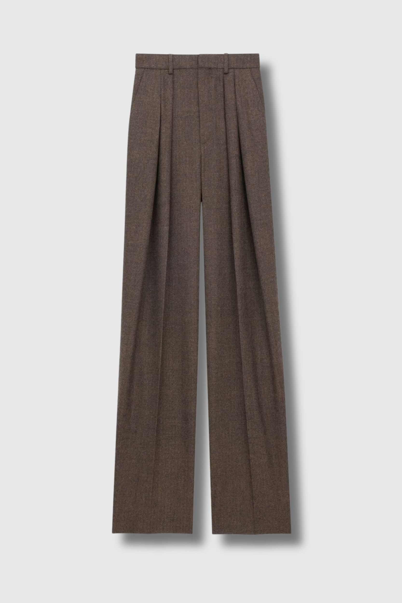 Ce pantalon en chevron estompé est signé Saint Laurent. Celui-ci présente un double pli, un pli central, deux poches en biais sur le devant et deux poches passepoilées à l'arrière. Cette pièce possède une coupe ample et se porte taille mi-haute.