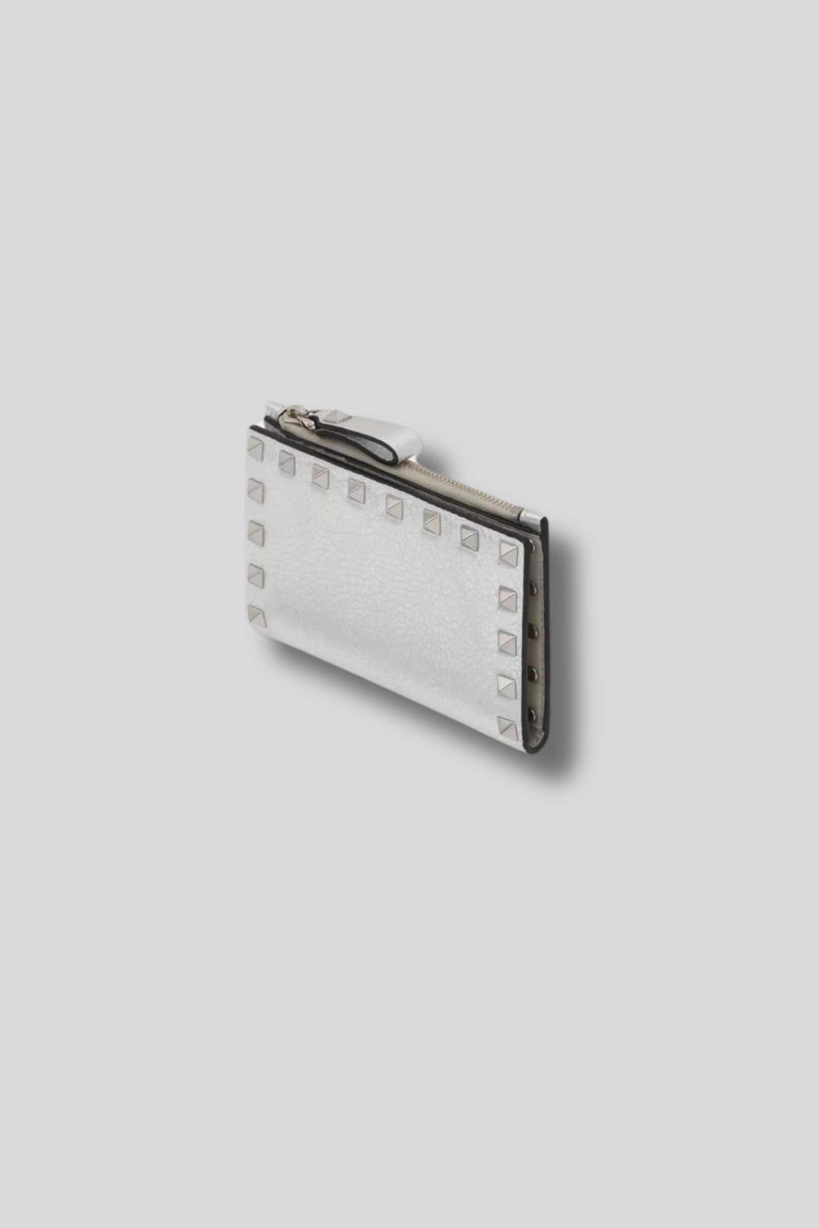 Ce porte-carte en cuir de veau métallisé est signé Valentino Garavani. Il est réalisé en cuir grainé et est doté de petits clous Rockstuds argenté. Fermeture à bouton-pression et fermeture zippée pour le compartiment monnaie.