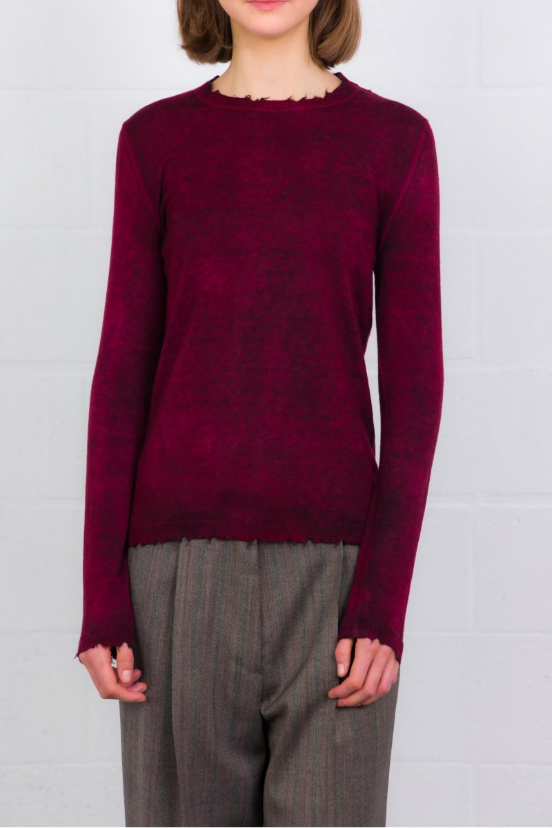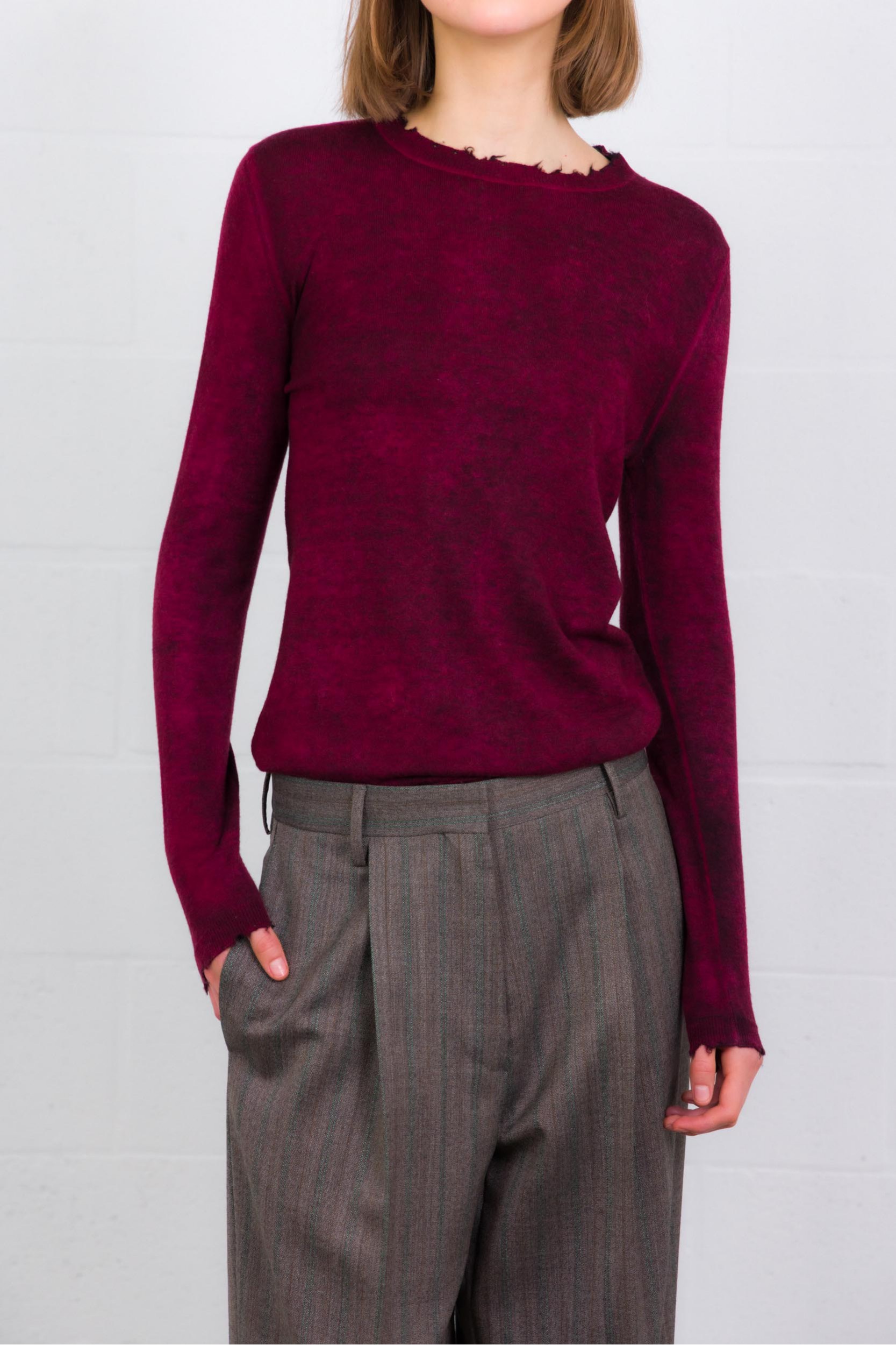 Icône du savoir-faire italien, ce pull Avant Toi séduit par son élégance discrète et sa couleur “wine” profonde, entre rouge bordeaux et prune. Confectionné dans un mélange luxueux de cachemire et de soie, il offre une texture douce et fluide au toucher.