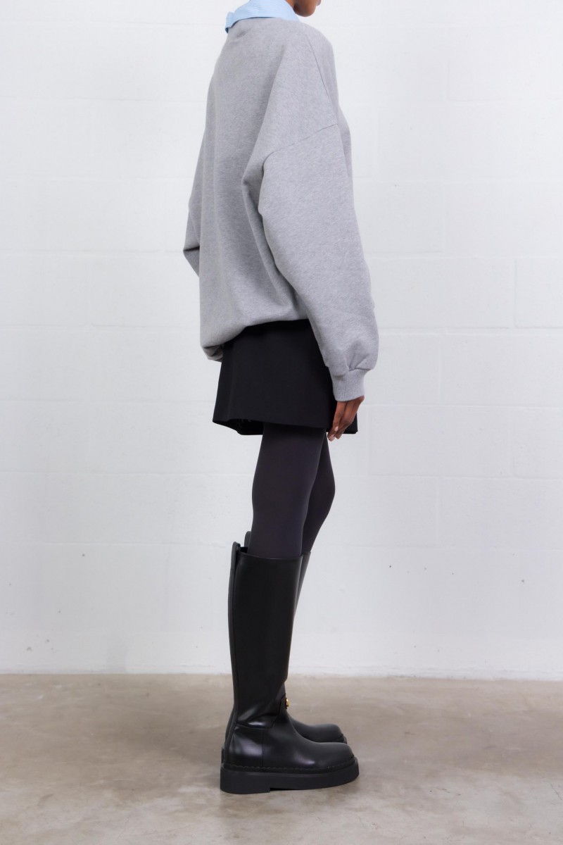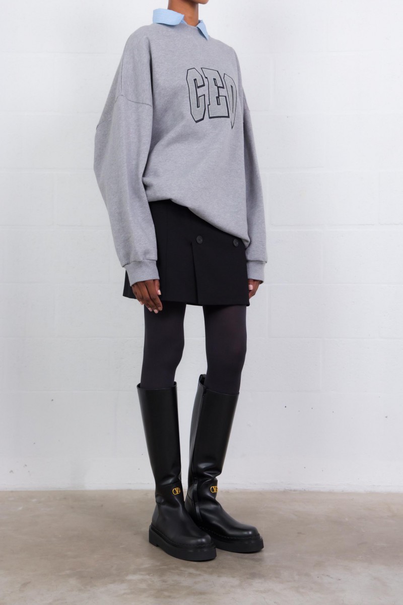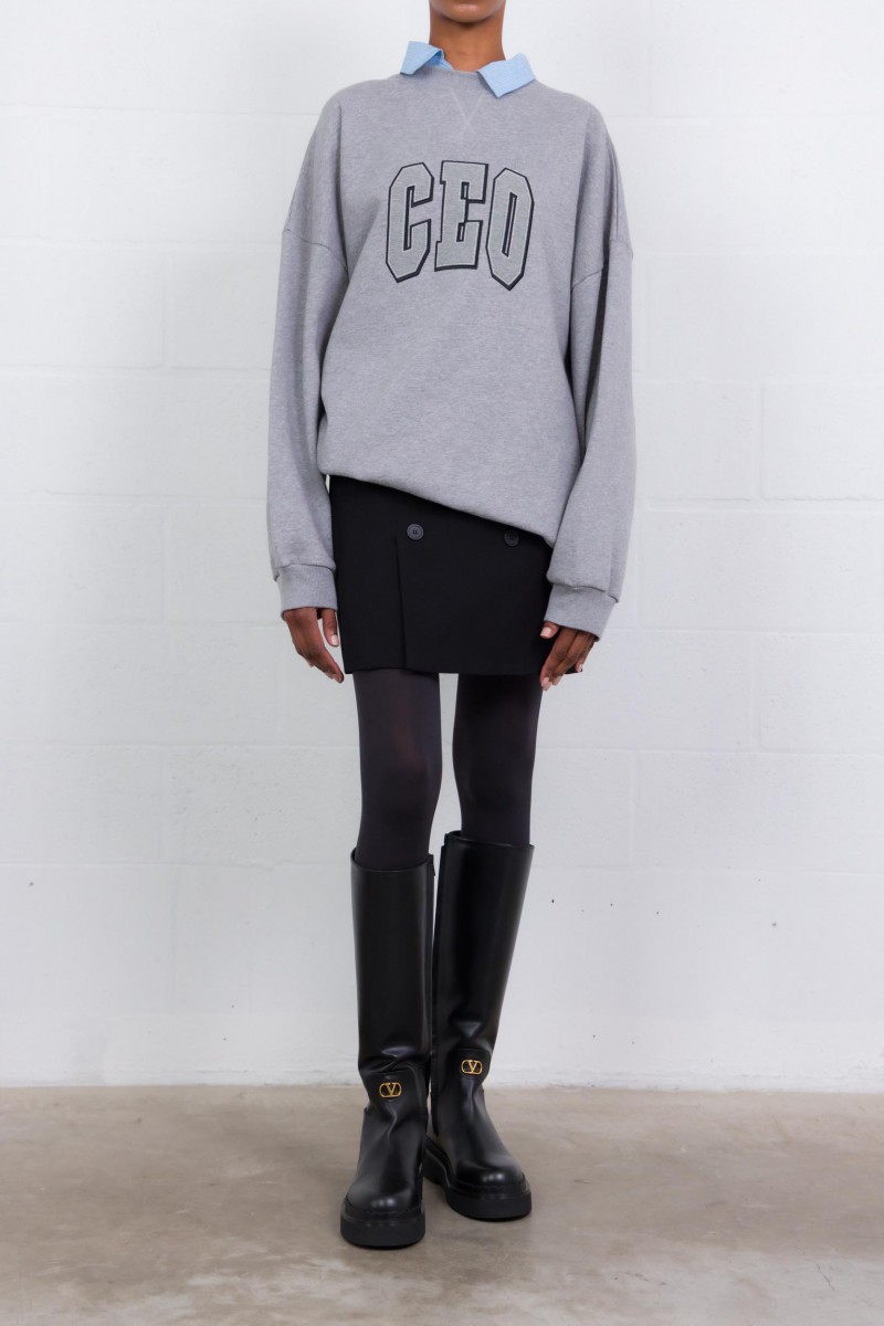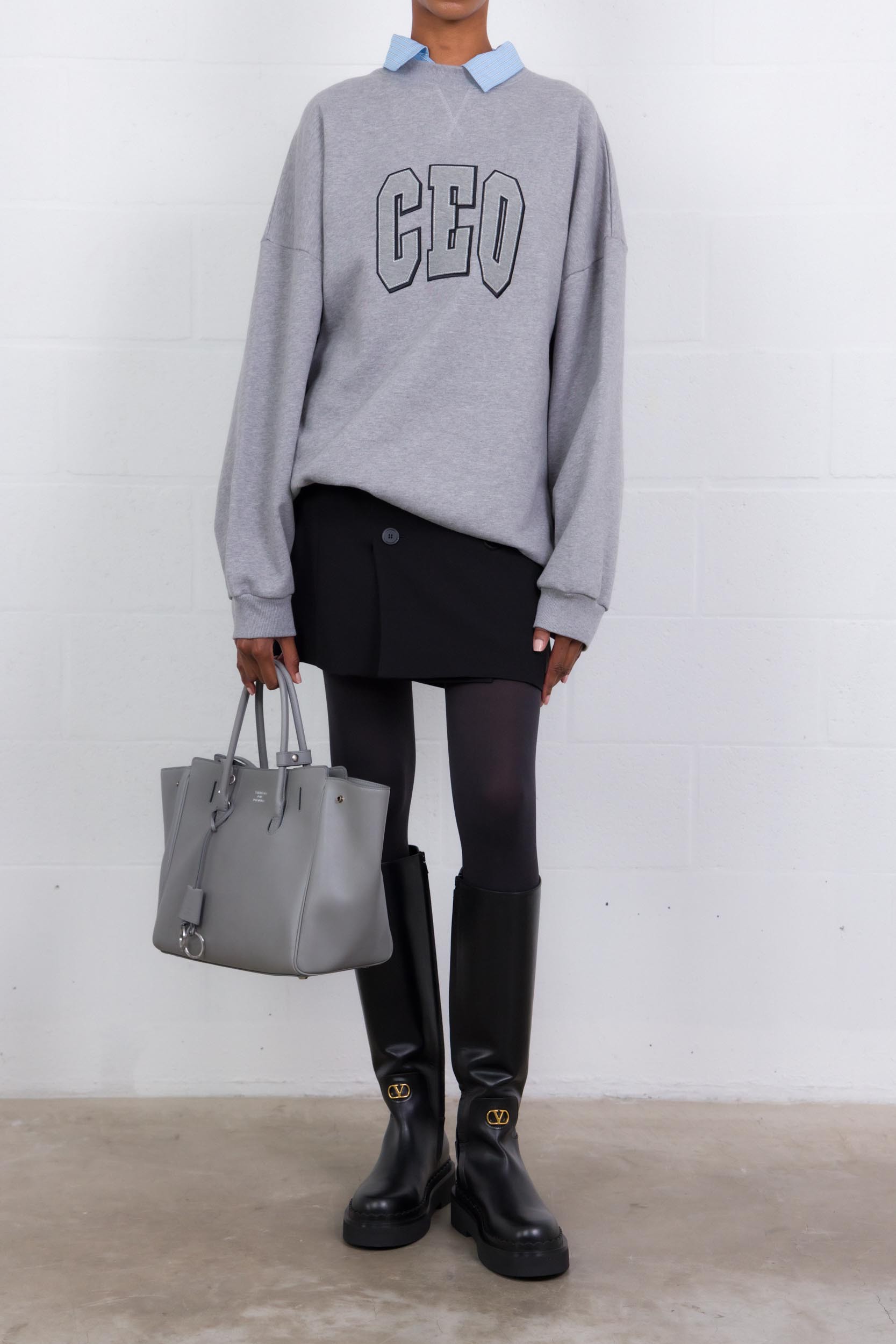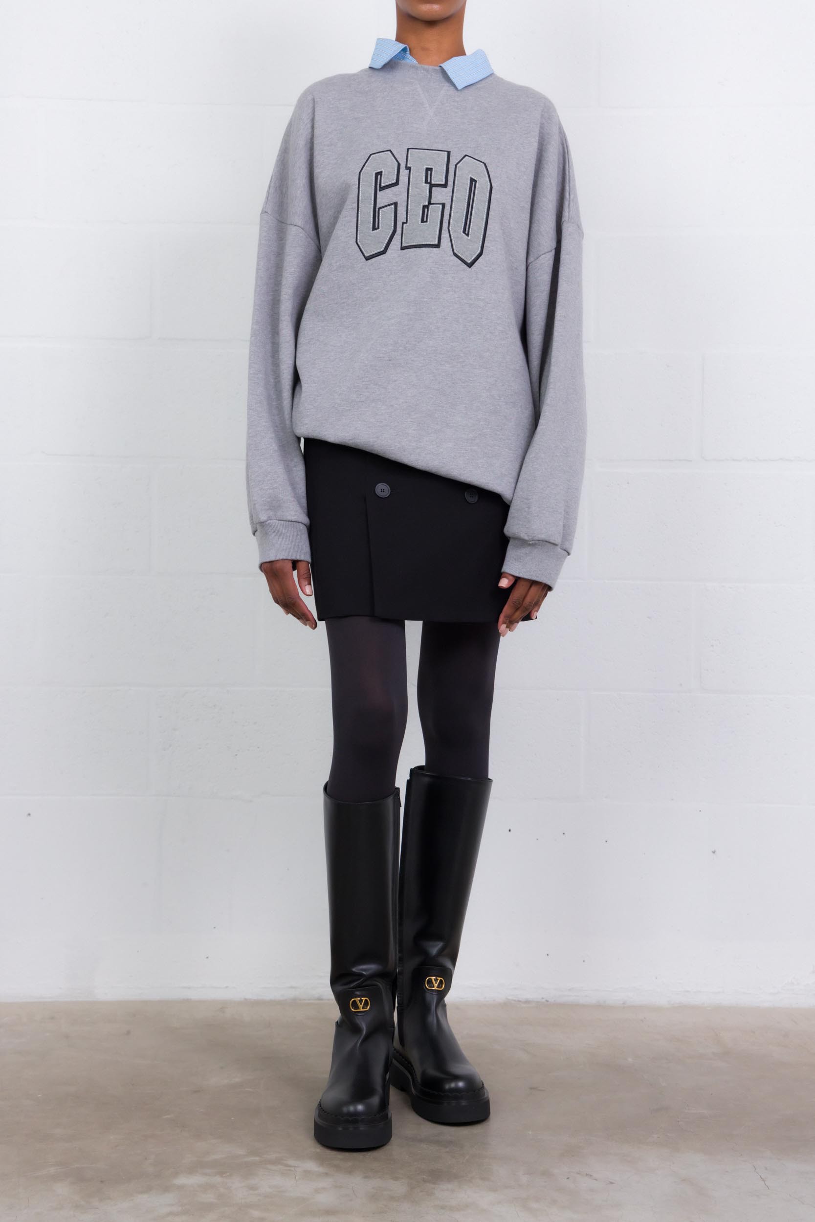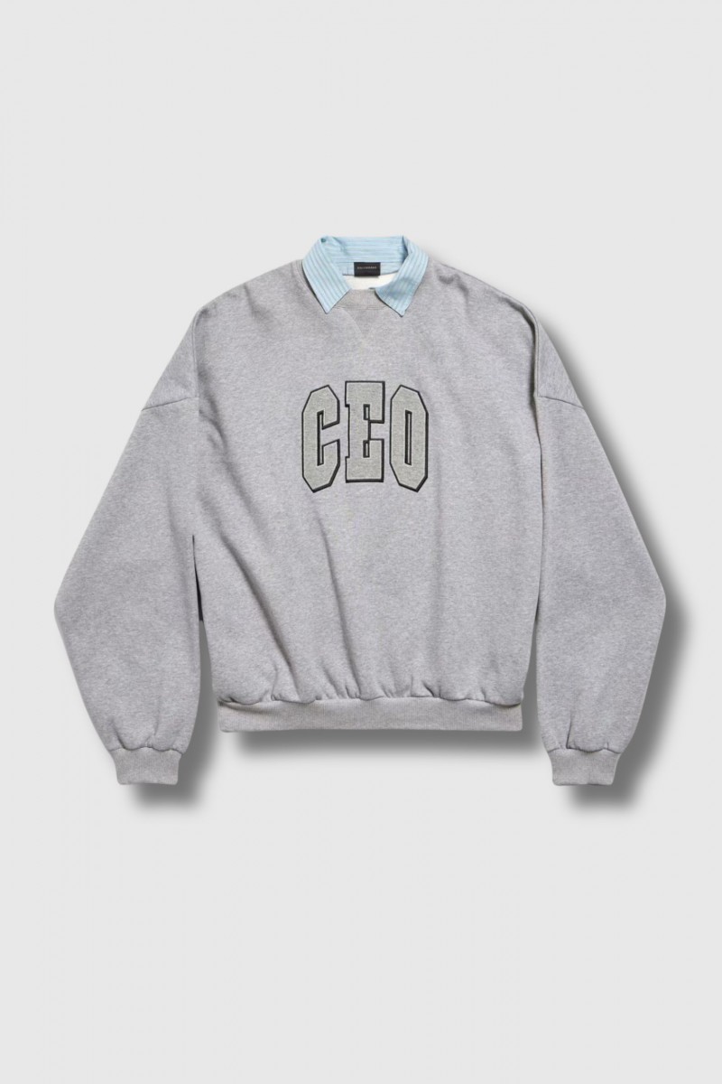 Ce pull "CEO" gris avec col chemise est signé Balenciaga. Celui-ci présente des épaules tombantes, des manches longues et un col chemise rond. Cette pièce possède une coupe oversized.