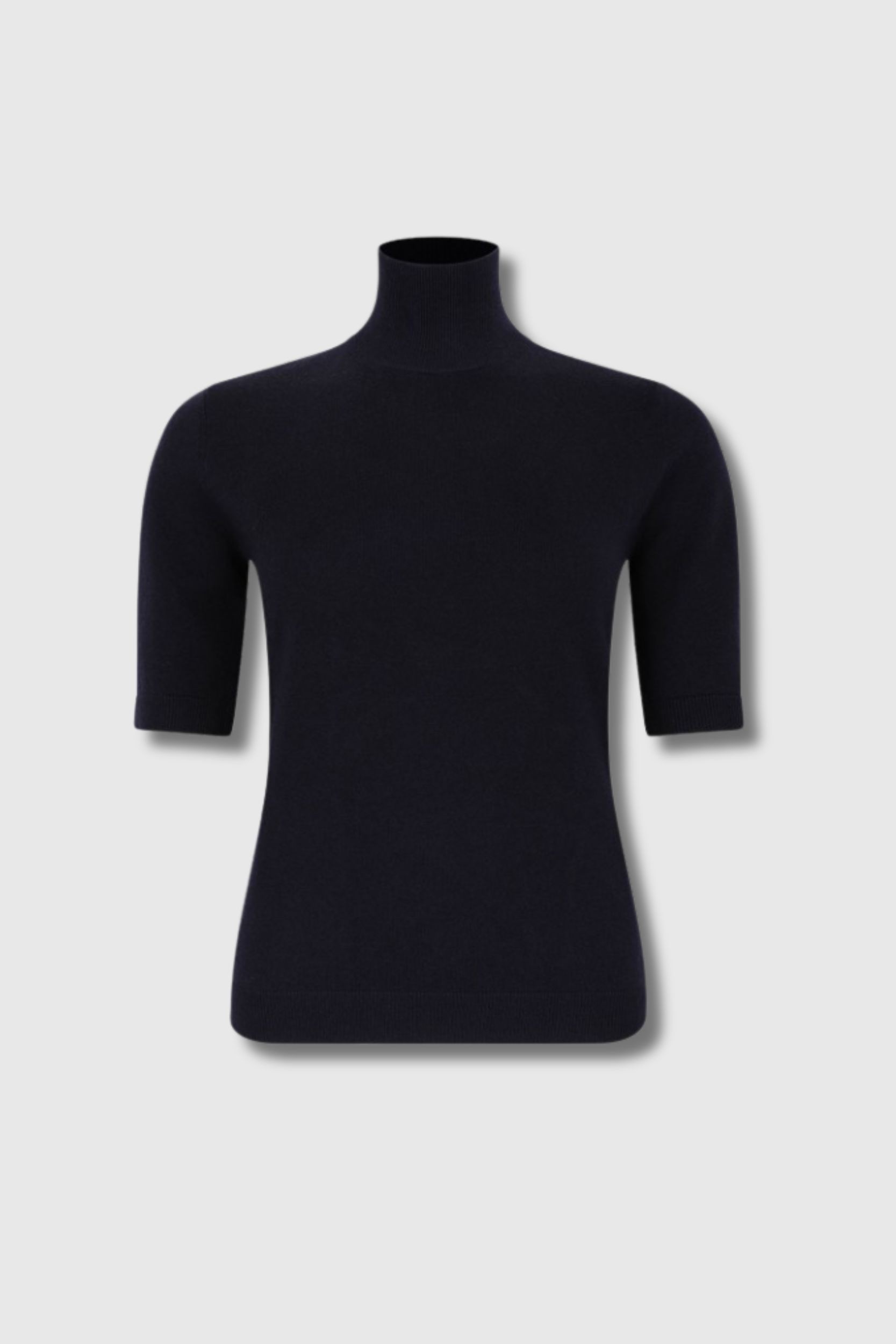 Ce pull Cantone marine signé MaxMara est confectionné en laine fine. Il présente un col roulé élégant, des manches courtes et des finitions côtelées, pour une silhouette à la fois sobre et raffinée.