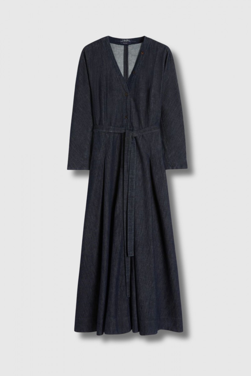 Cette robe longue Ambra bleu marine signée Max Mara conjugue élégance décontractée et allure féminine. Confectionnée en denim indigo de pur coton délavé en pièce, elle présente une ligne évasée subtilement marquée à la taille, mise en valeur par une ceinture assortie. Son décolleté en V et ses manches kimono 3/4 ornées de boutons bijoux apportent une touche sophistiquée, tandis que la fermeture boutonnée sur toute la longueur, avec boutons en corne, renforce son esprit chemise. Dotée de poches passepoilées sur les côtés, cette pièce polyvalente se porte aussi bien au quotidien que pour des occasions plus élégantes.
