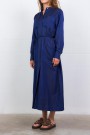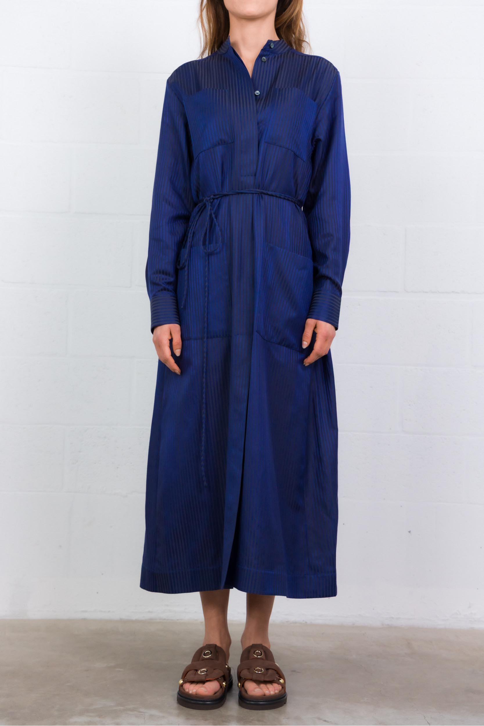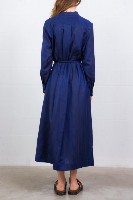Cette robe Birmingham bleu marine est signée Indress. Silhouette iconique de la Maison, elle est confectionnée en jacquard de coton et soie à rayures, tissé par Les Tissages Perrin. Elle présente une coupe droite structurée, avec quatre poches plaquées, un jeu de plis plats le long de la patte de boutonnage et une fente sur le devant. Une ceinture cordon assortie permet de marquer la taille selon l’allure souhaitée.
