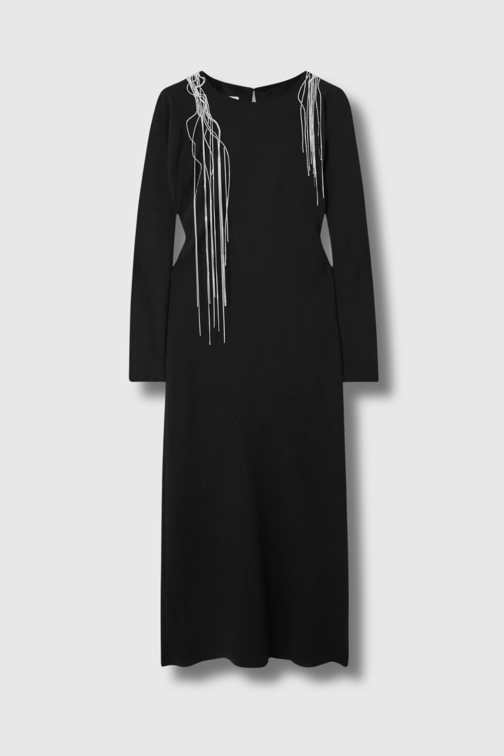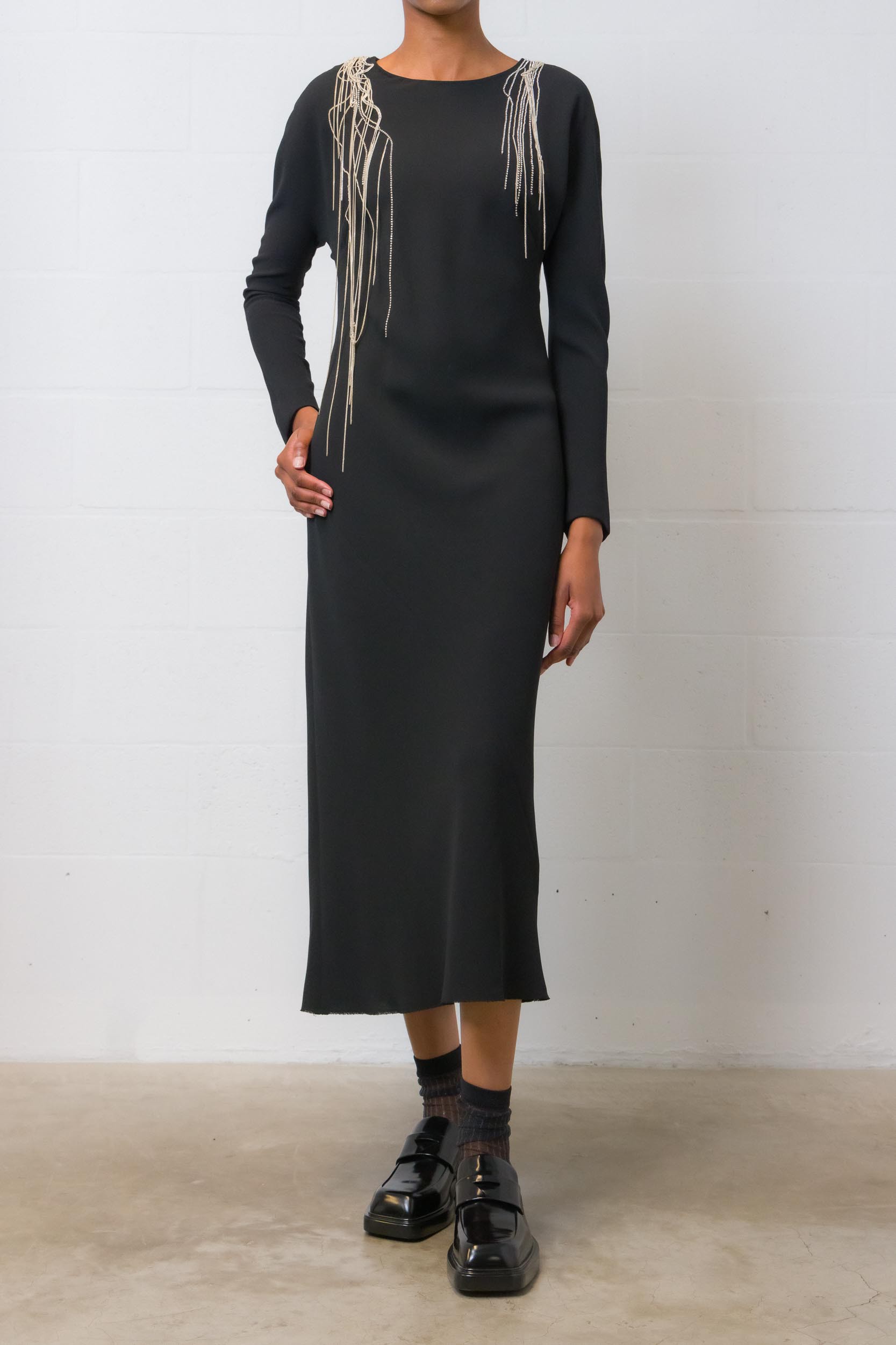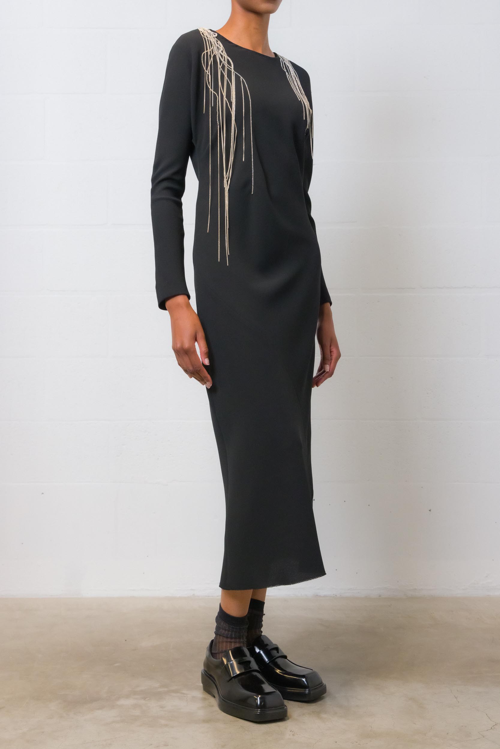 Cette robe en crêpe de Chine noire, signée Dries Van Noten, est ornée de rangées de cristaux scintillants et de chaînes en curb tombant de manière aléatoire sur le devant. Elle offre une taille subtilement cintrée.