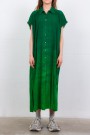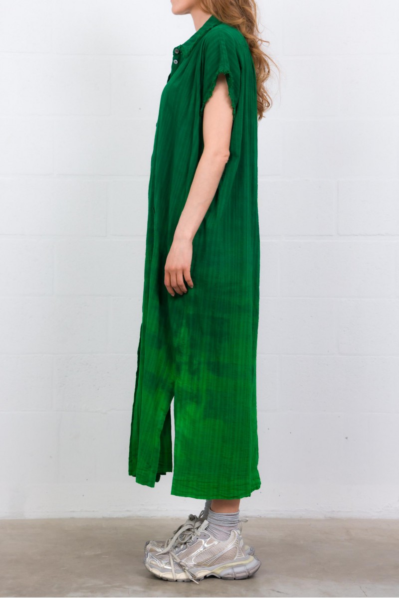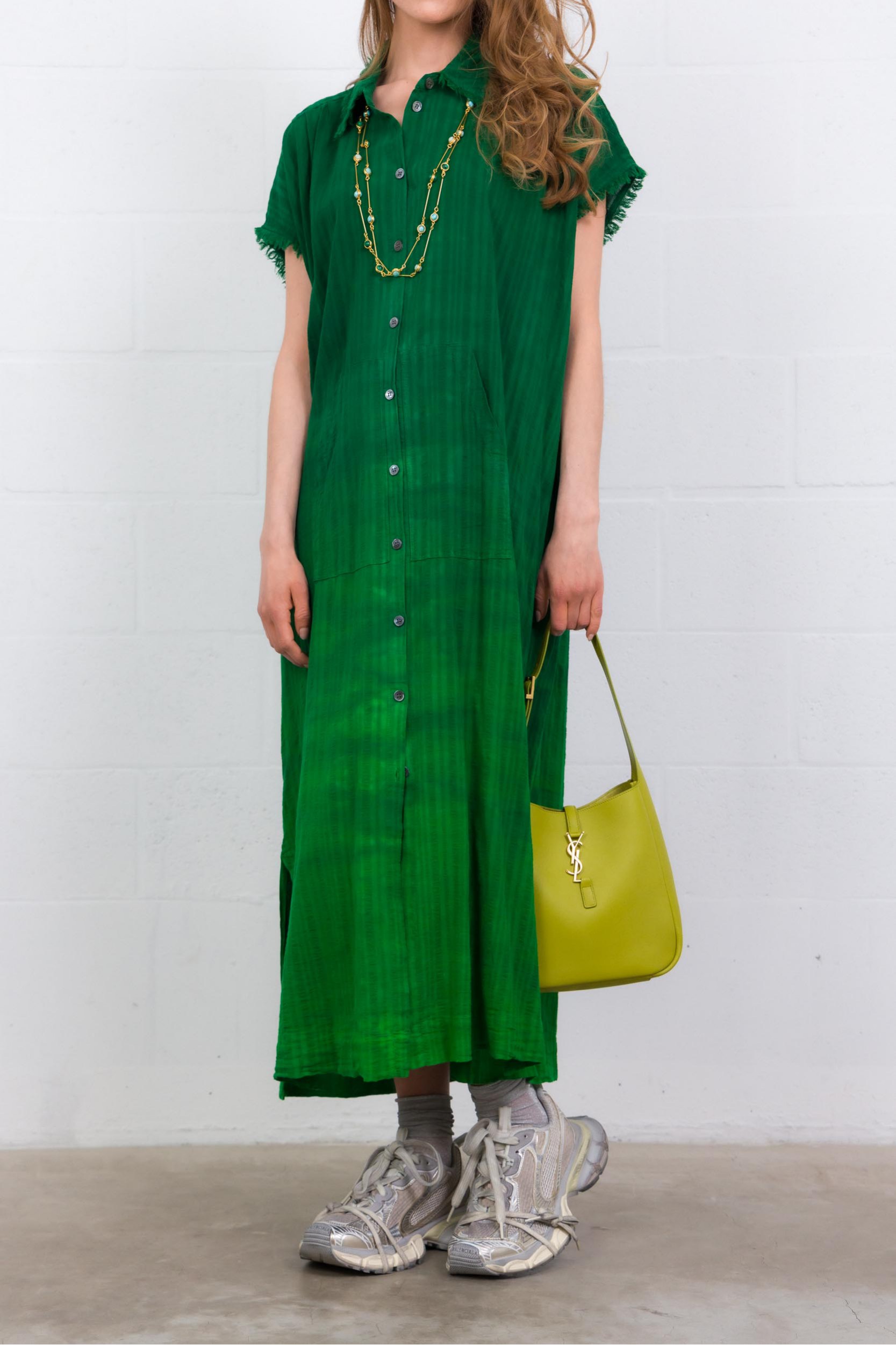 Cette robe caftan Rainbow en coton vert est signée Raquel Allegra. Confectionnée en coton, elle présente une coupe ample et fluide. Dotée d’un col chemise, de manches courtes frangées et d’une fermeture boutonnée, elle incarne un style décontracté et contemporain.