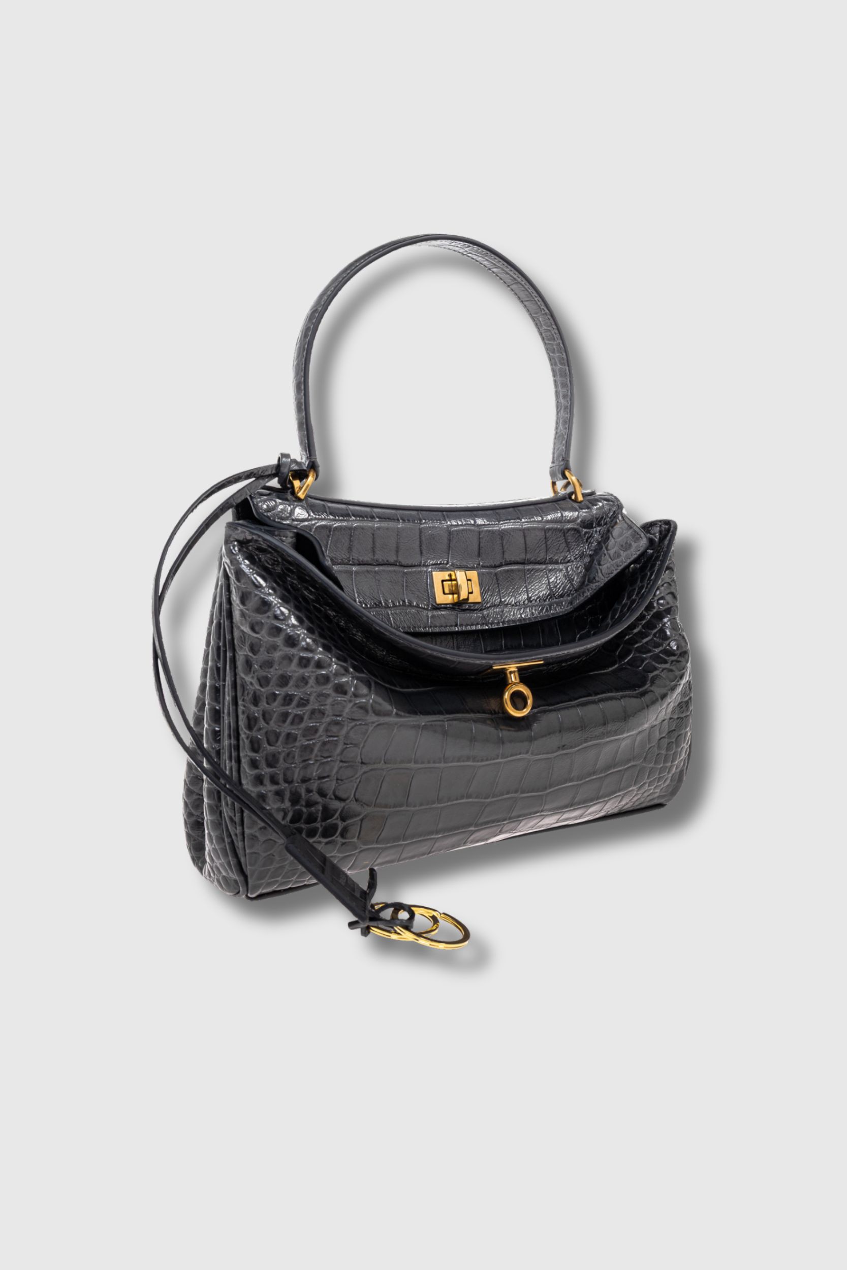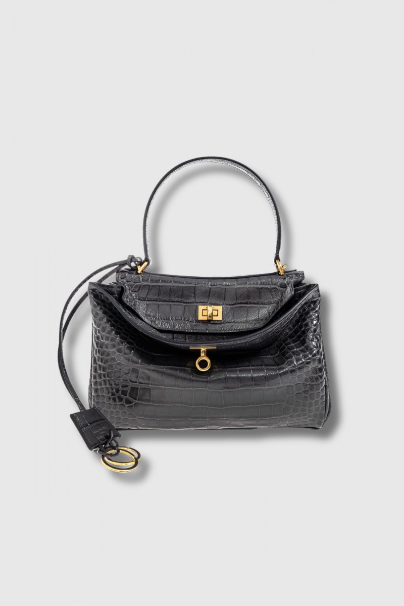Confectionné en cuir de veau embossé façon croco, il révèle un brillant exceptionnel et une texture raffinée. Sa teinte graphite profonde, légèrement irisée, se marie parfaitement avec le fermoir doré, rehaussé de deux détails carrés et d’une quincaillerie décorative. L’héritage prestigieux de Balenciaga assure un savoir-faire d’exception et l’unicité de ce design.