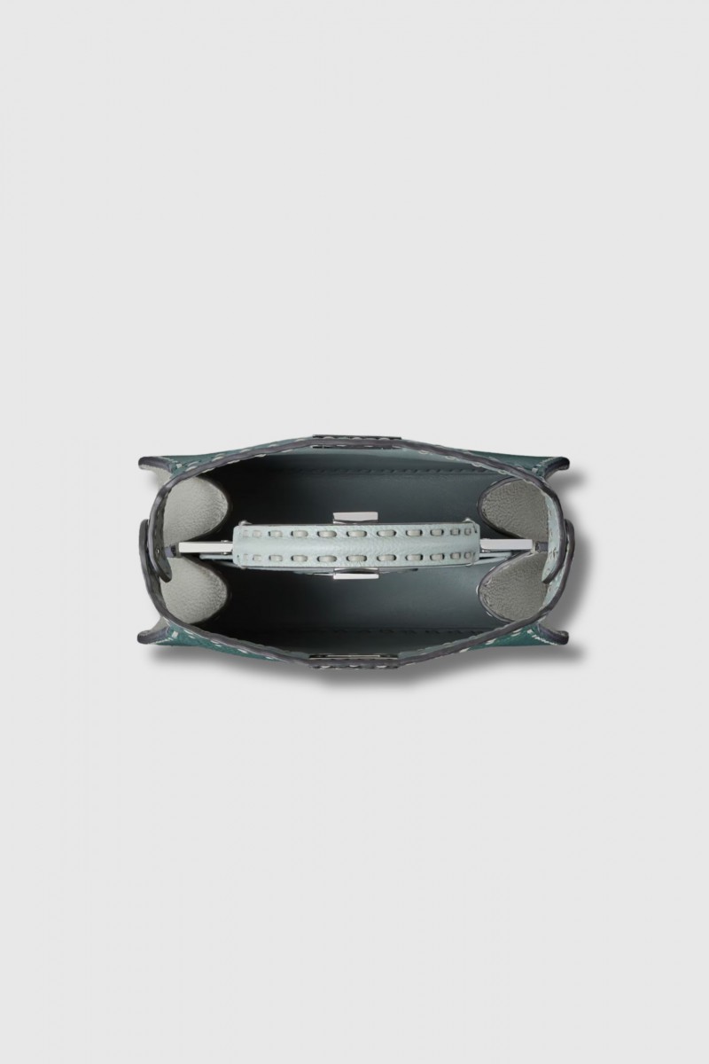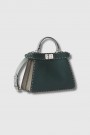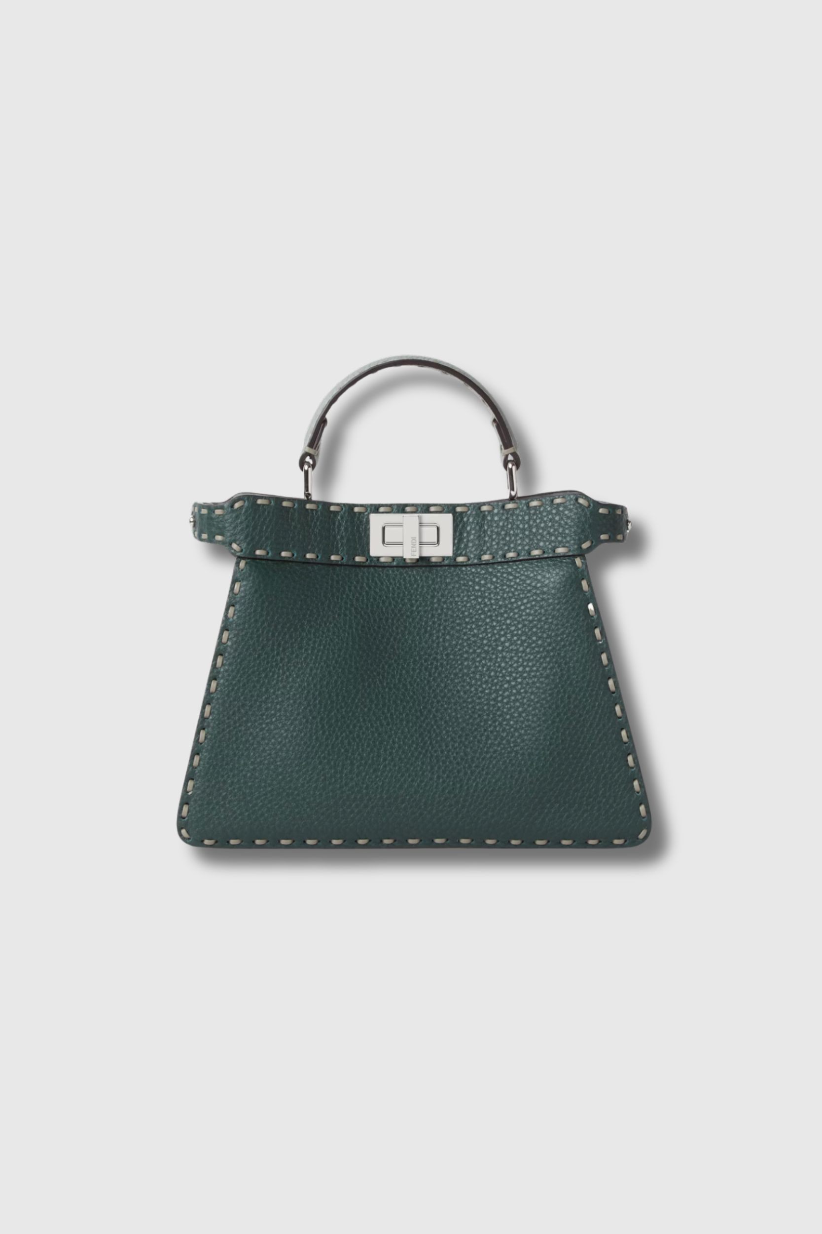 Ce sac Peekaboo ISeeU medium bicolore est signé Fendi. Icône de la maison, il est réalisé en cuir Cuoio Romano vert foncé avec côtés gris tourterelle, souligné de 556 gros points Selleria cousus main, héritage artisanal depuis 1925. Son intérieur doublé en cuir de veau se compose de deux compartiments séparés par une paroi rigide et d’une poche. Fermoir-tourniquet emblématique, plaque Selleria en argent et garnitures palladium complètent le design. Sa poignée et sa bandoulière réglable et amovible en cuir vert matcha offrent un porté main, épaule ou croisé.