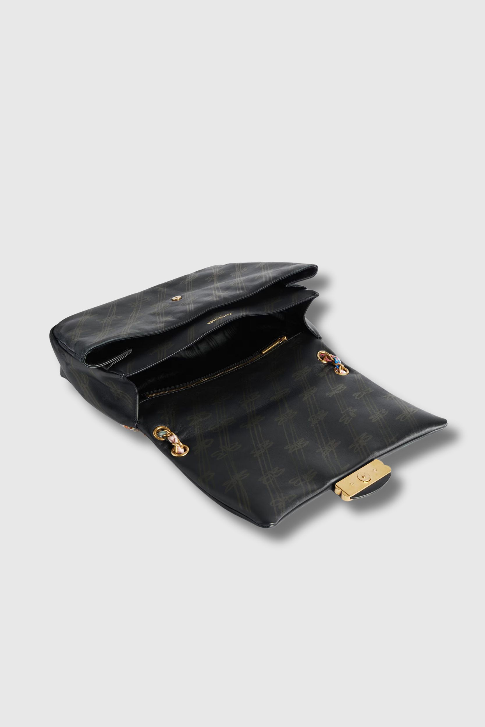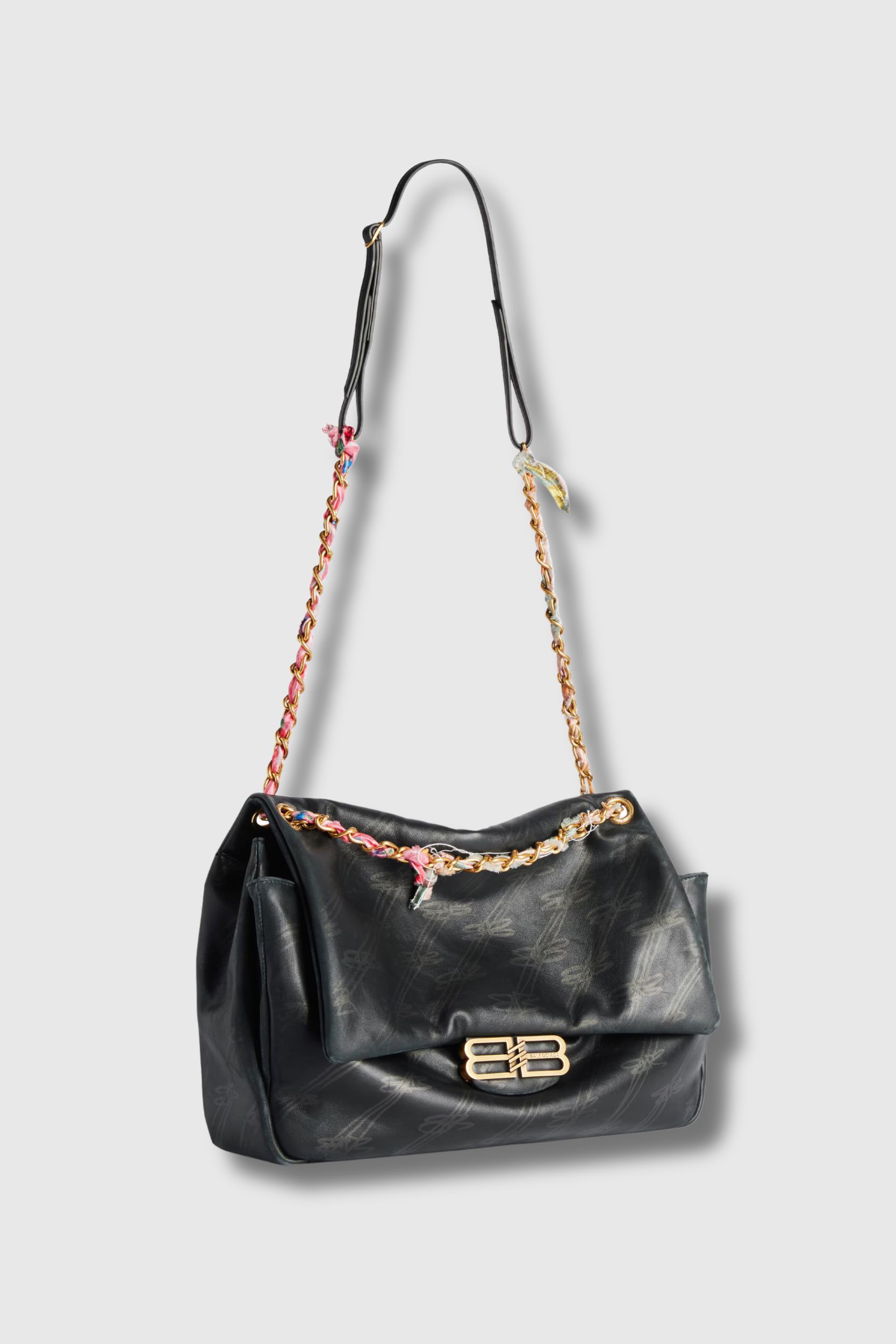 Réalisé en cuir de veau souple à imprimé BB monogram, il se distingue par sa bandoulière chaîne coulissante rehaussée d’un ruban, permettant un porté épaule ou croisé. Son rabat incurvé orné du logo BB icon en métal doré vieilli s’ouvre sur un fermoir aimanté clouté.