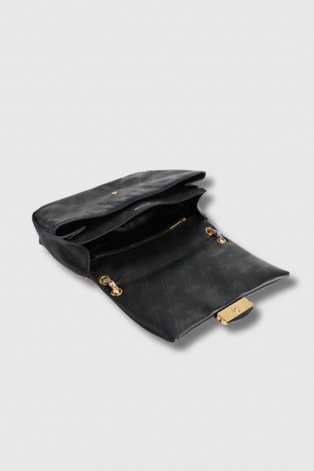 L’intérieur comprend un compartiment principal, une poche zippée et deux poches plates à l’arrière, complétés d’une poche avant sous le rabat. Doublure en moiré.