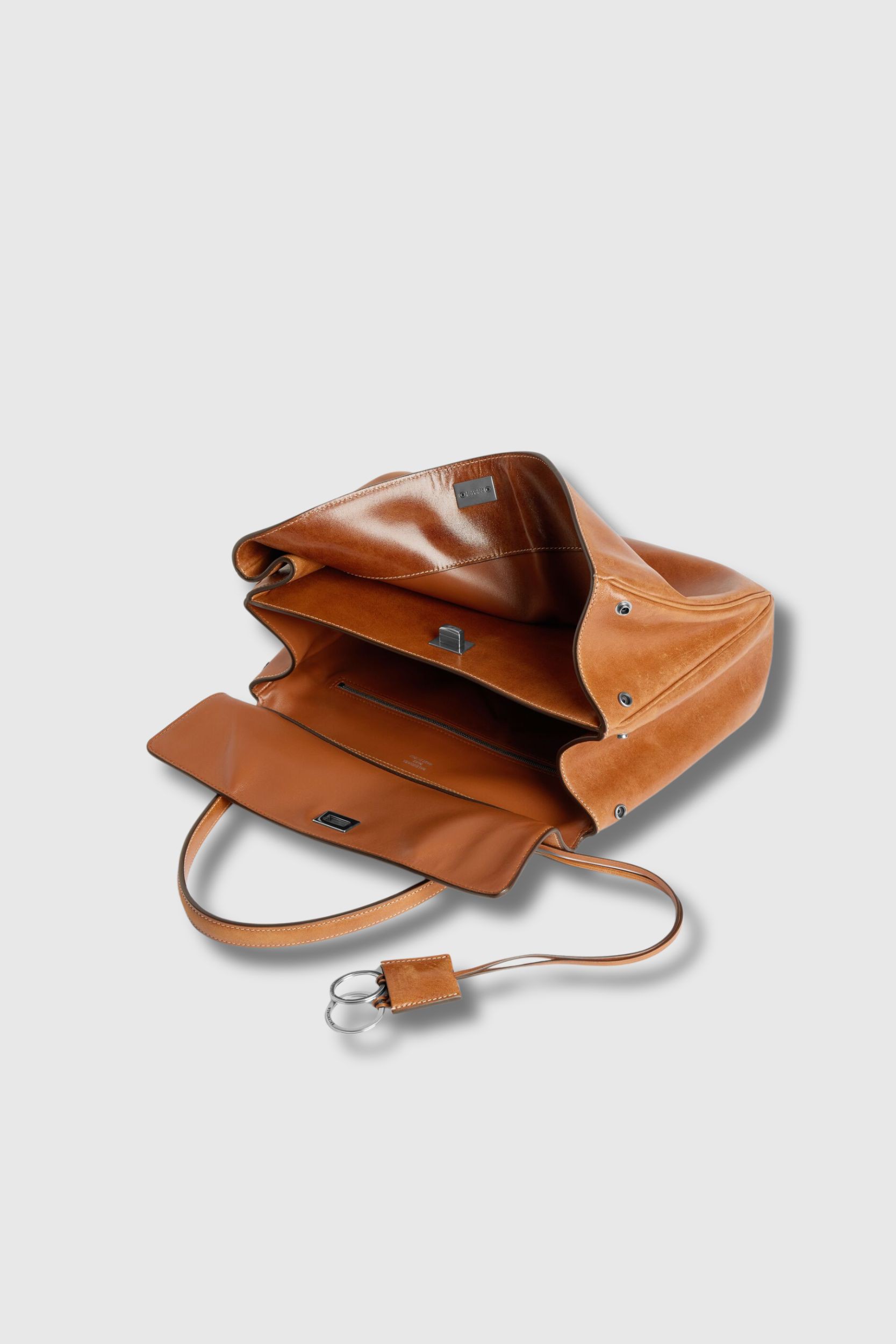 Le modèle présente un porte-clé cloche amovible doté de deux anneaux fendus, un fermoir pivotant caractéristique, ainsi qu’une grande poche frontale. L’intérieur offre un compartiment principal spacieux, une poche zippée, et l’extérieur comporte deux poches plates au dos. Les boutons-pression latéraux permettent d’ajuster le volume, tandis que les quatre pieds en laiton assurent protection et stabilité.
