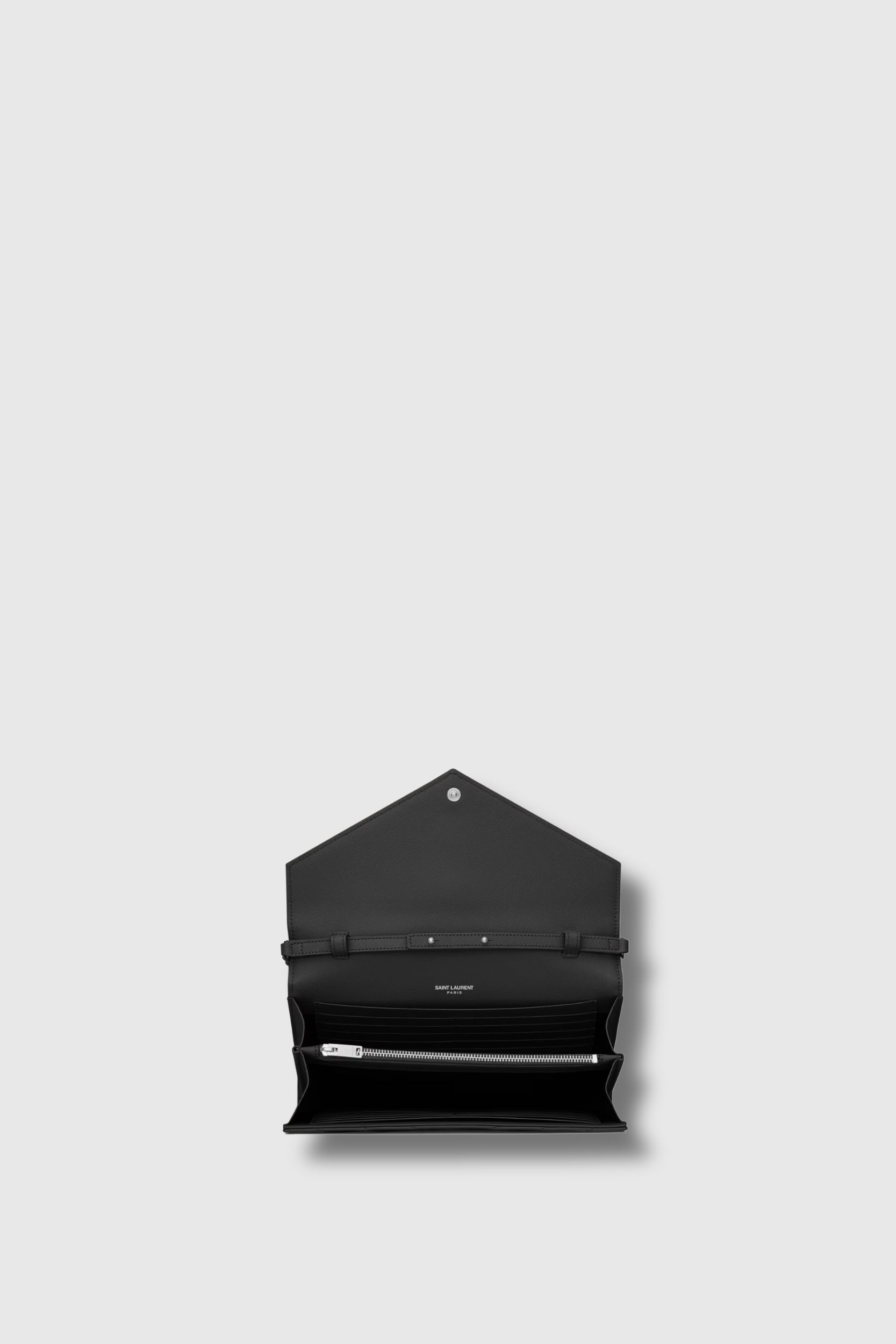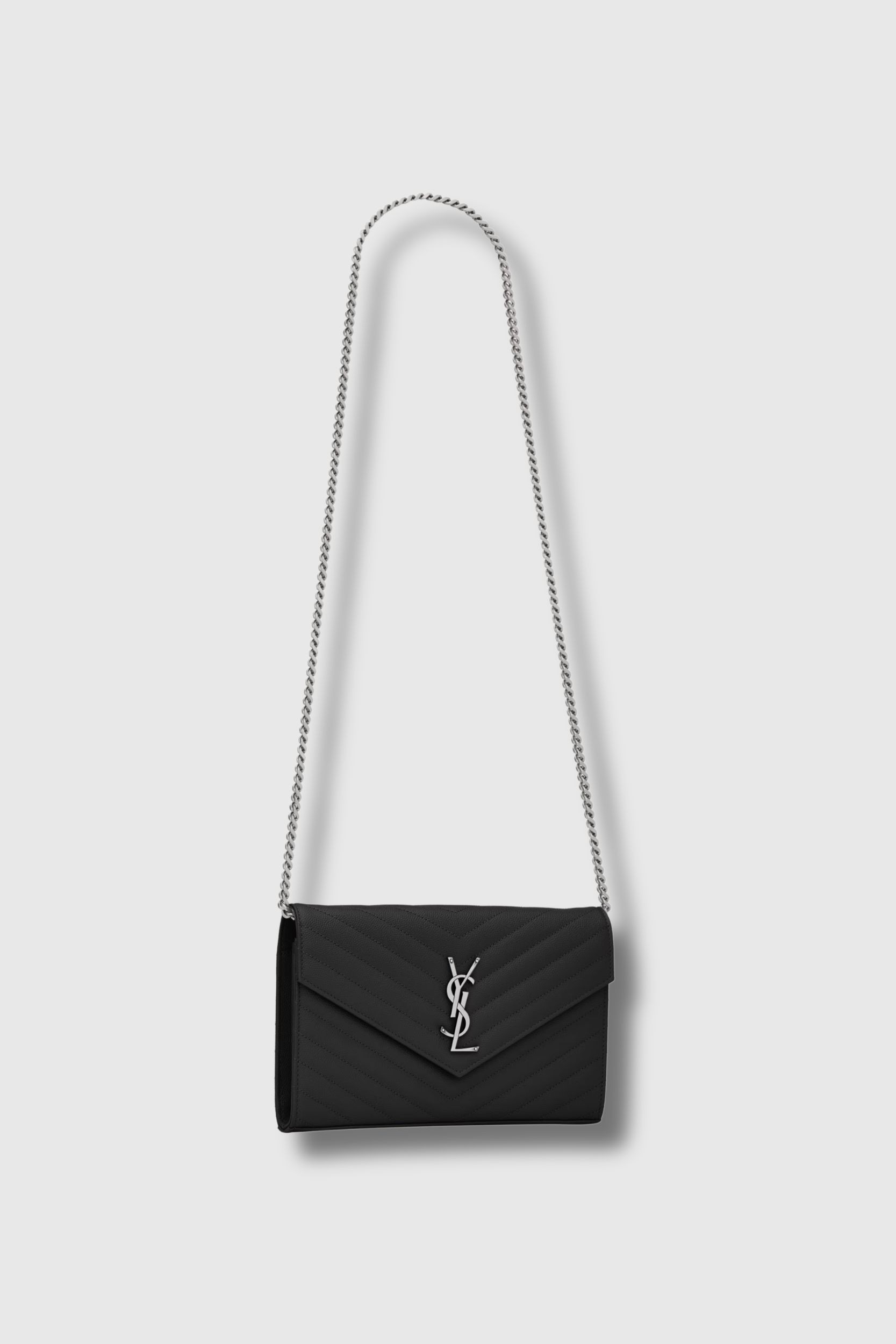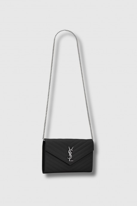 Ce sac Wallet on Chain noir signé Saint Laurent est une pochette à chaîne intemporelle, ornée du Cassandre et matelassée en chevrons iconiques. Fonctionnelle, elle offre deux compartiments centraux, une poche zippée, une fente à billets et dix fentes pour cartes. Sa chaîne amovible permet un porté à l’épaule ou en pochette à la main. Confectionnée en cuir tanné sans chrome ni métal et doublée de cuir, elle est agrémentée d’une bijouterie en laiton argenté et d’une fermeture par bouton-pression, alliant élégance et praticité.