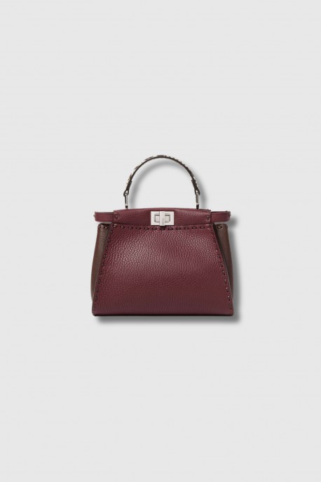 Ce sac Peekaboo mini bordeaux signé Fendi incarne le savoir-faire Selleria, signature de la Maison depuis 1925, avec ses 220 larges surpiqûres cousues main. Confectionné en cuir Cuoio Romano bordeaux aux côtés marron, au grain naturel obtenu par un tannage sans métal, il révèle une élégance authentique. Son intérieur doublé de cuir de veau comprend deux compartiments séparés et une poche intérieure. Orné du fermoir-tourniquet iconique, d’une plaque Selleria en argent et de garnitures palladium, il se porte à la main, à l’épaule ou en bandoulière grâce à sa poignée en python couleur pierre et sa bandoulière amovible. Compact et fonctionnel, il accueille les essentiels du quotidien.