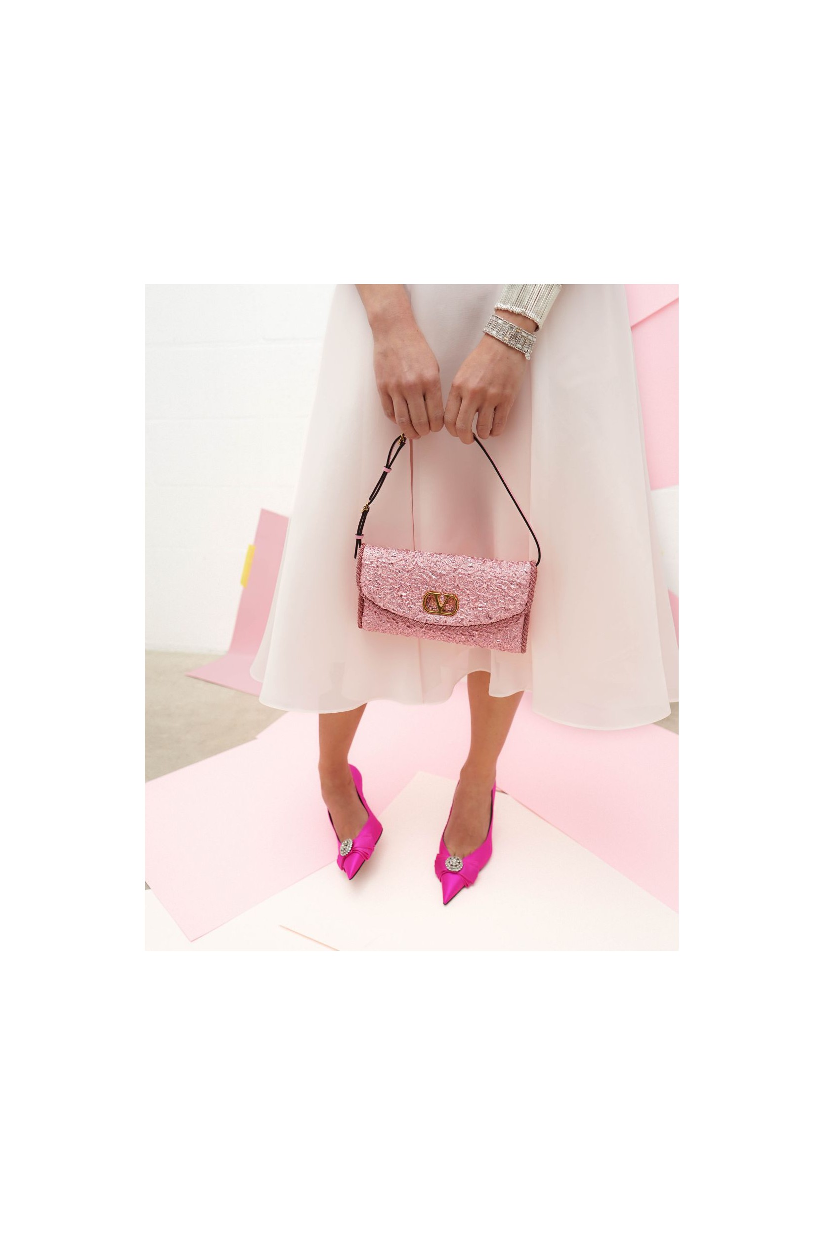 Ce sac à main rose signé Valentino Garavani se distingue par son élégance raffinée et son format compact. Le modèle DeVain est confectionné en tissu jacquard cloqué et sublimé par un ornement métallique VLogo Signature à la finition Antique Brass. Doté d’une anse réglable et de détails en cuir de veau grainé, il peut se porter aussi bien à la main qu’à l’épaule. Sa fermeture aimantée assure praticité et sécurité, tandis que l’intérieur doublé de satin, équipé d’une poche plate, offre un rangement soigné pour les essentiels.