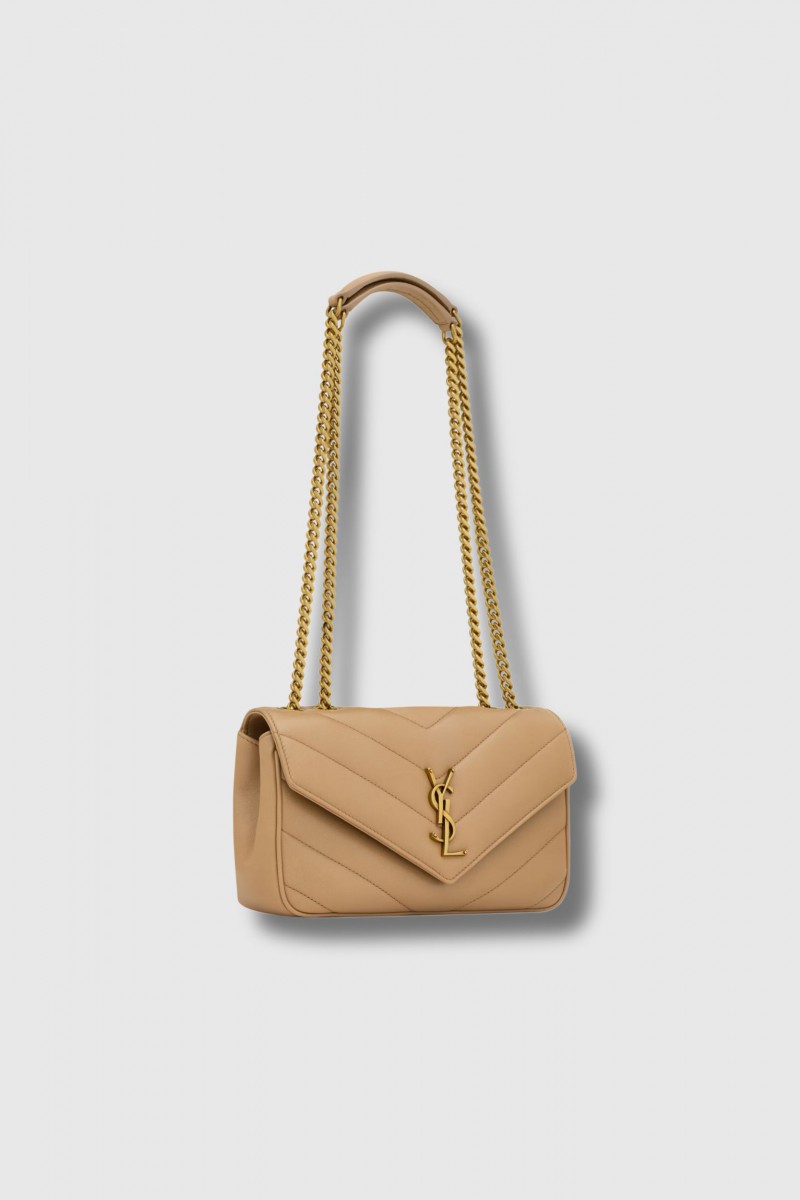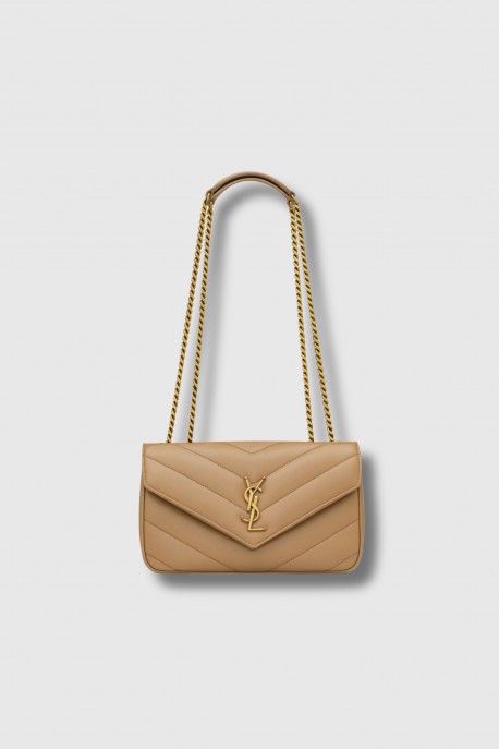 Ce sac Loulou small beige signé Saint Laurent est réalisé en cuir d’agneau souple, sublimé par l’iconique matelassage en chevrons. Élégant et fonctionnel, il est doté d’une chaîne coulissante permettant un porté épaule ou croisé. Son intérieur doublé en coton accueille une poche plaquée, une pochette amovible en cuir ainsi qu’un miroir de poche. La fermeture par bouton pression aimanté et la bijouterie en laiton finition light bronze complètent ce modèle emblématique au style intemporel.