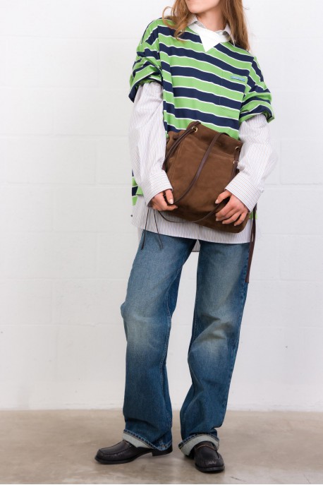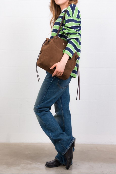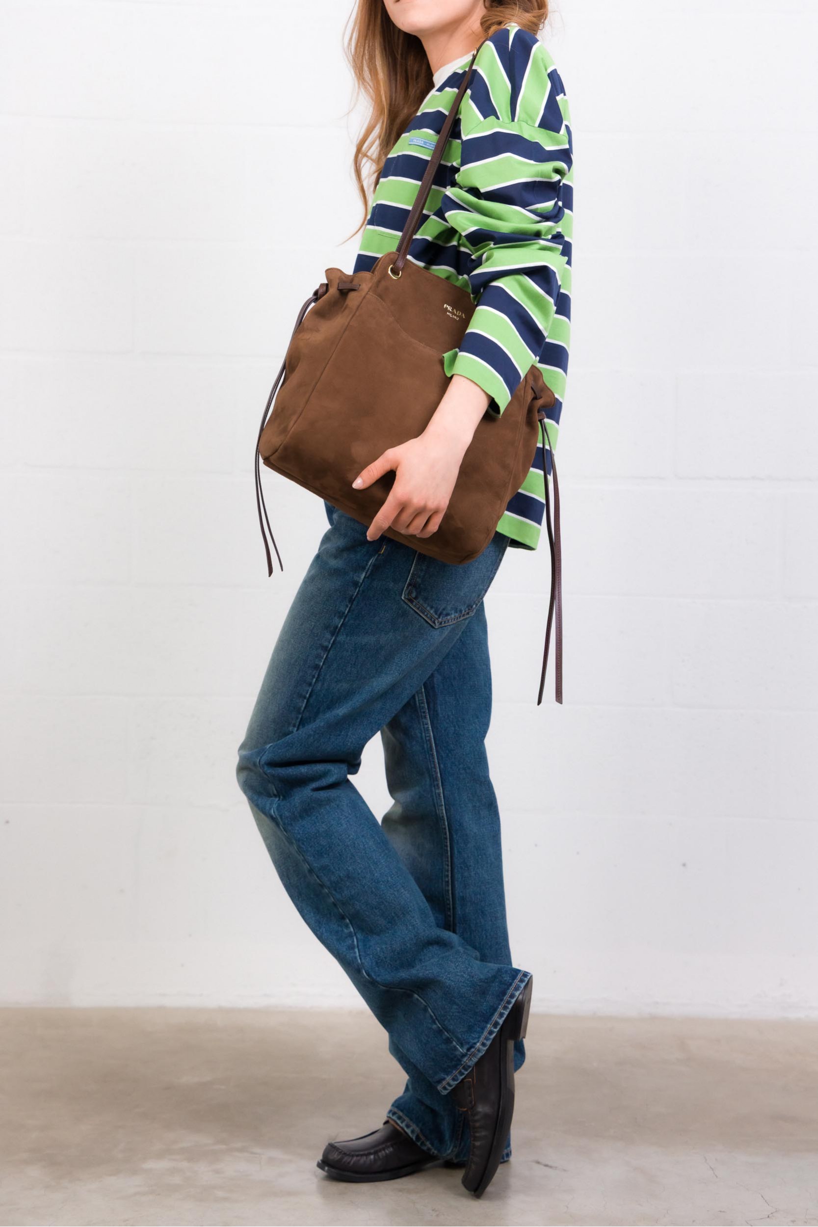 Ce sac fourre-tout en daim marron signé Prada allie simplicité et sophistication. Confectionné en veau velours, il offre une structure spacieuse idéale pour le quotidien. Ses poignées coulissantes permettent de varier le porté et de transformer l’apparence du sac selon les envies. Les détails d’archive et le logo lettres apportent une touche emblématique, combinant élégance contemporaine et signature iconique Prada.