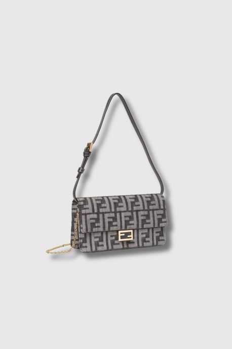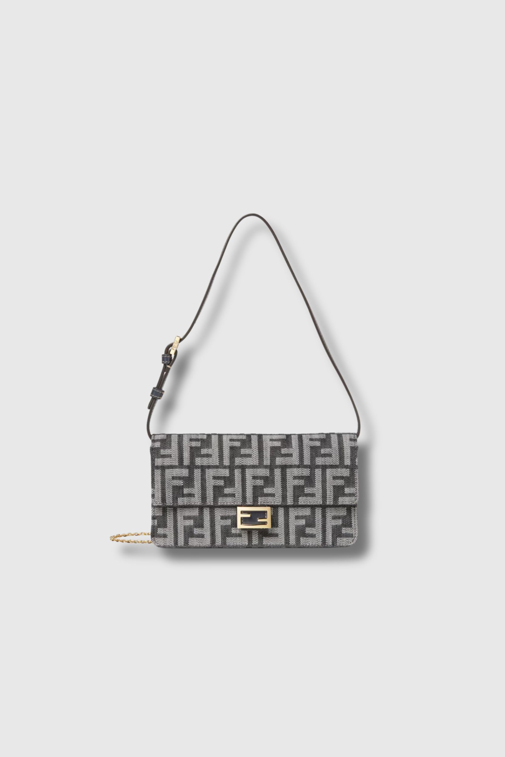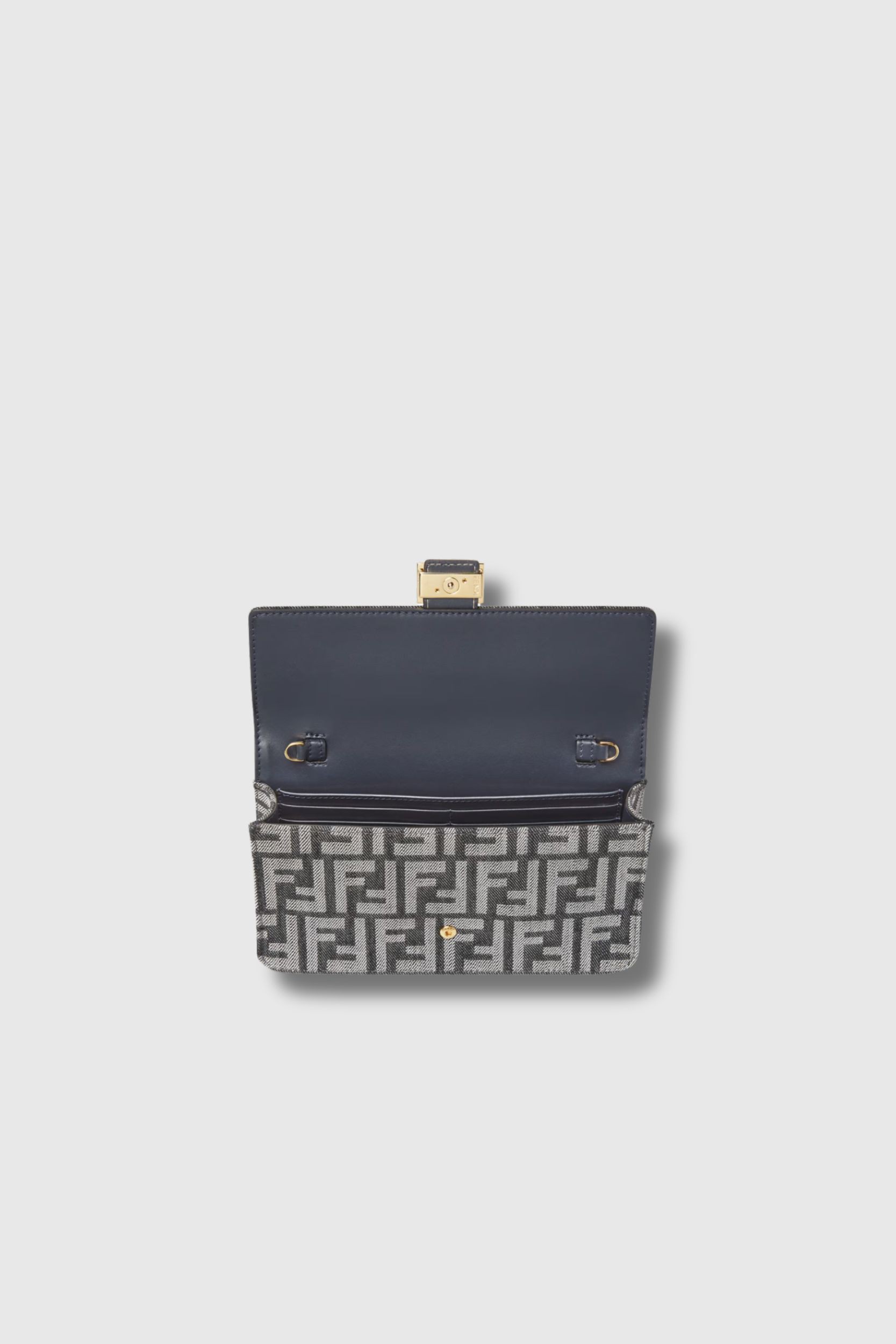 Ce sac Chain Wallet Baguette en jacquard FF signé Fendi conjugue élégance et fonctionnalité dans un format compact. Confectionné en jacquard FF effet denim dans des tons bleu foncé, il est rehaussé d’un rabat avec fermoir FF iconique et de garnitures en métal doré. L’intérieur est astucieusement organisé avec six fentes porte-cartes, idéal pour un usage quotidien ou en soirée. Polyvalent, il se porte de multiples façons grâce à ses deux bandoulières : une en cuir réglable et une chaîne fine amovible, permettant un porté épaule, croisé, sous le bras ou à la main comme une pochette chic.