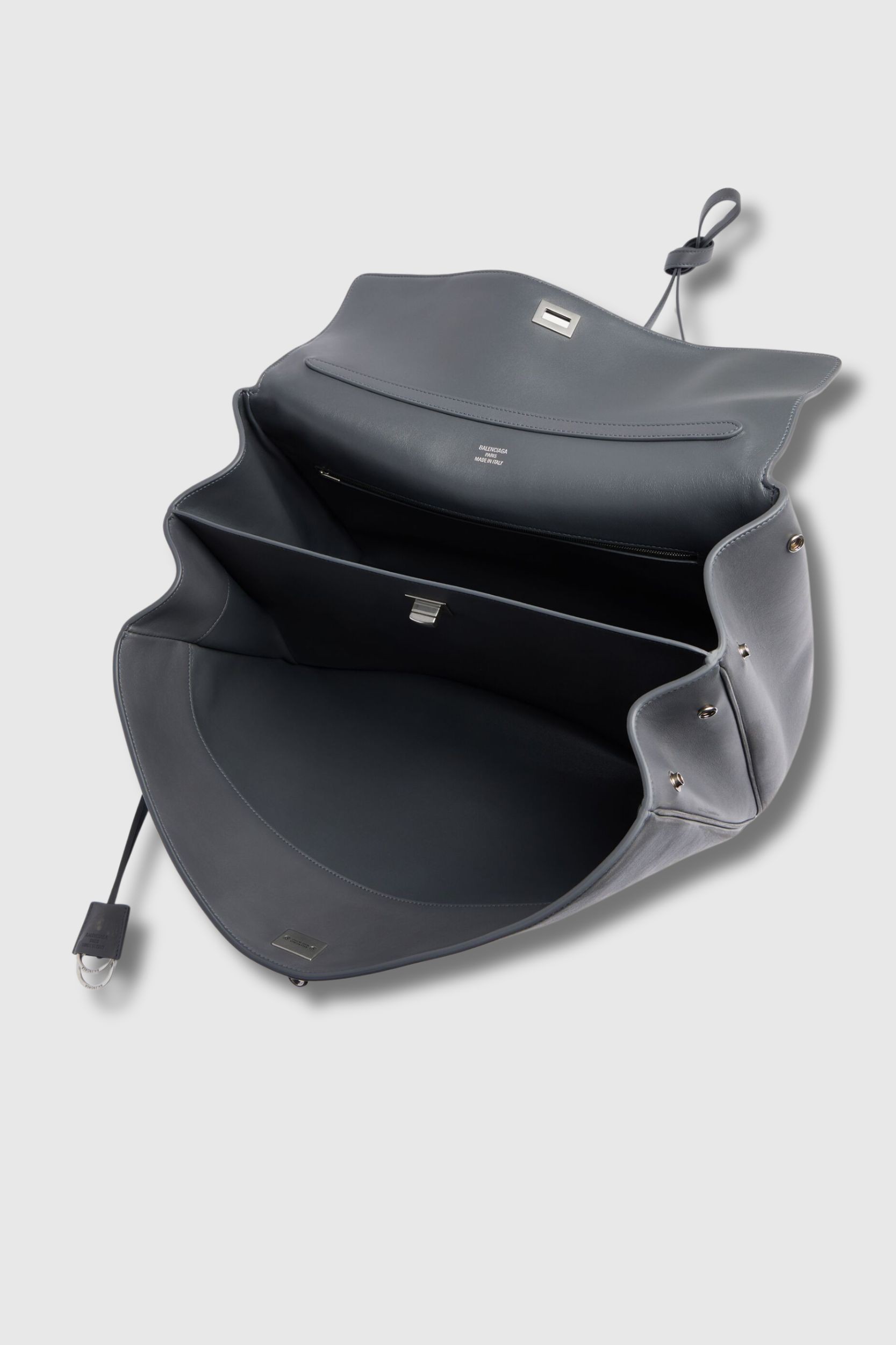 Le Sac Rodéo Large Gris Tag signé Balenciaga associe allure brute et élégance contemporaine. Confectionné en cuir de veau lisse et polyamide, il présente un artwork tattoo usé imprimé pour un effet patiné moderne. Doté d’une poignée unique, de lacets effet vieilli, d’une bandoulière amovible et d’un porte-clés cloche détachable, il se distingue par ses finitions argent vieilli et son fermoir pivotant. Fonctionnel, il offre une grande poche avant, un compartiment principal, une poche intérieure zippée et deux poches arrière plates, avec doublure en cuir d’agneau nappa.