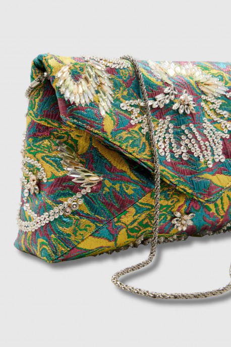 Ce sac pochette bijoux multicolore est signé Dries Van Noten. Raffiné et original, il se distingue par son design précieux aux nuances vibrantes. Doté d’une fine chaîne pour un porté élégant, il est complété par une fermeture à bouton aimanté, alliant style et praticité.