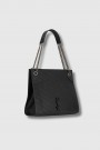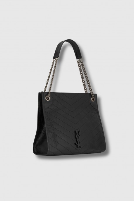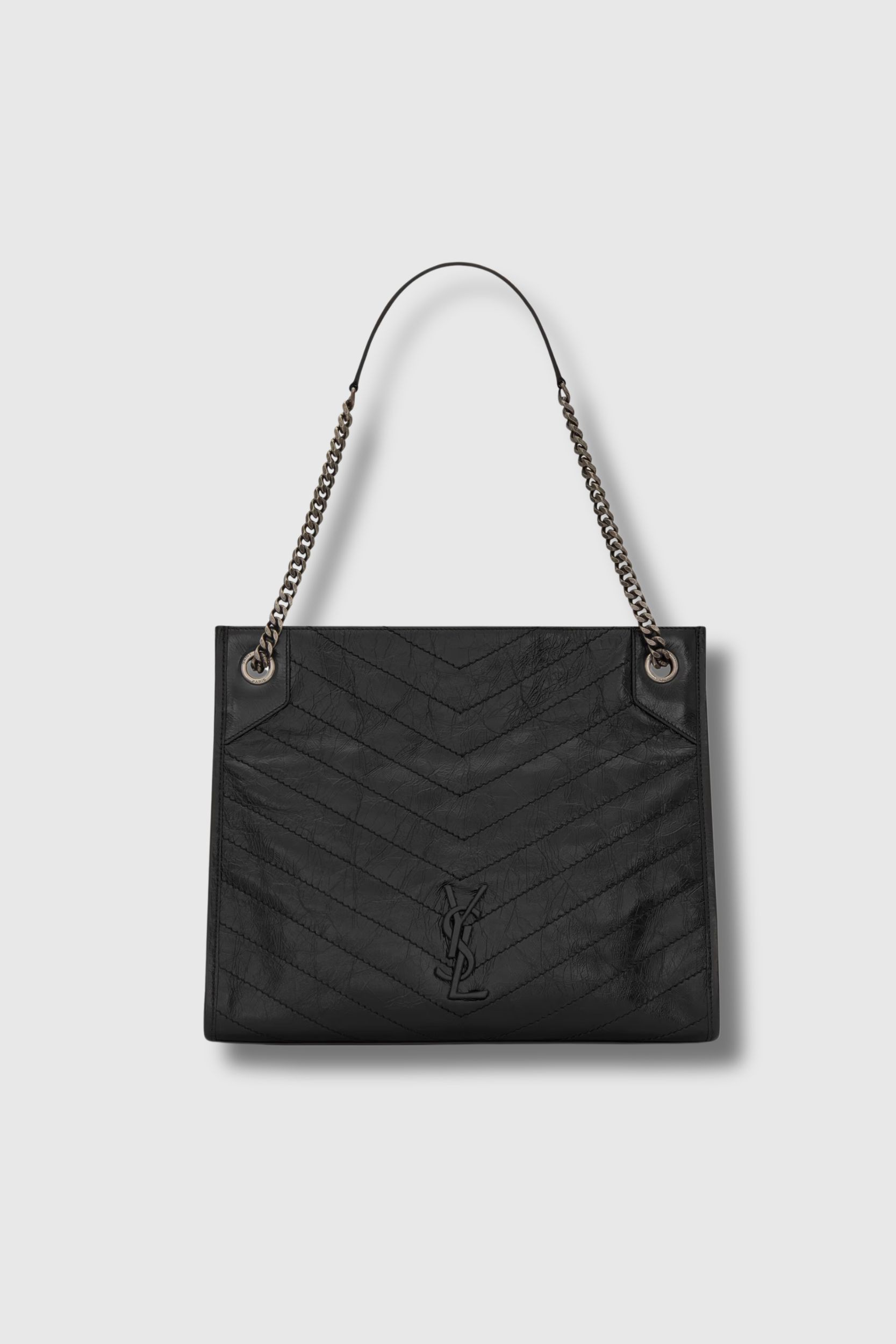 Ce shopping Niki noir galvanisé argent vieilli est signé Saint Laurent. Confectionné en cuir de veau vintage avec surpiqûres en chevrons, il est sublimé par le Cassandre gainé de cuir. Léger et spacieux, il est doté d’une chaîne coulissante pour un porté modulable. Réalisé en cuir tanné sans chrome ni métal, il est doublé en coton biologique. Le modèle est complété par une fermeture aimantée, une poche intérieure zippée et des finitions en palladium brossé.