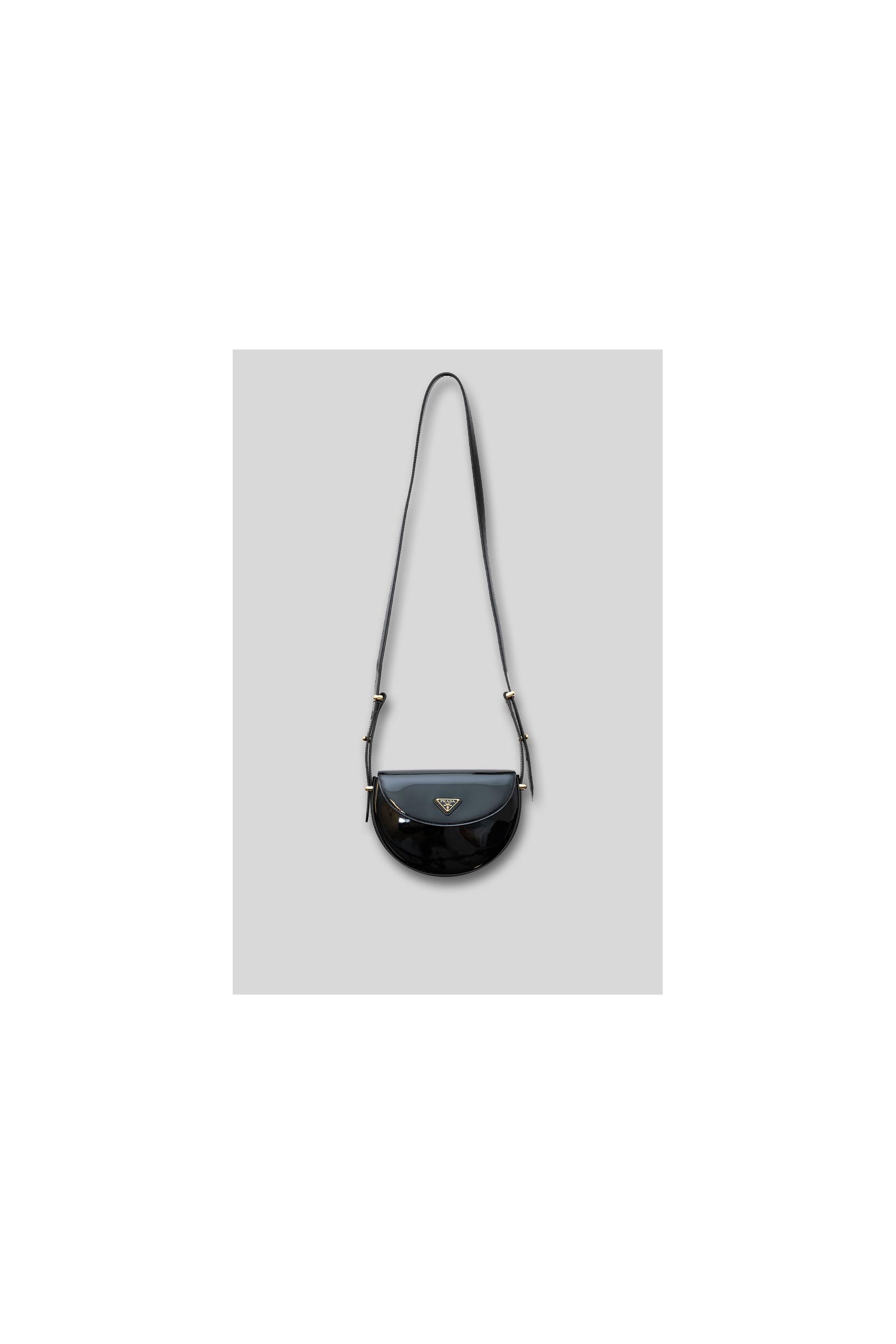 Ce sac à bandoulière en cuir verni noir est signé Prada. Arborant une élégante silhouette demi-lune de style besace, il est orné du logo doré distinctif de la marque.