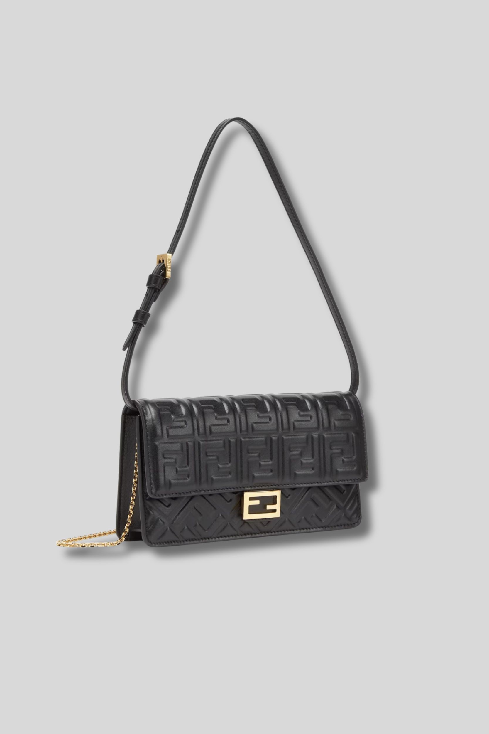 Ce sac portefeuille compact Baguette en cuir noir est signé Fendi. Il se caractérise par un rabat avec un fermoir FF. L'intérieur comprend six fentes pour cartes. Il dispose de deux bandoulières : une réglable en cuir et une amovible en chaîne fine, permettant de le porter sous le bras, en bandoulière croisée ou à la main comme une pochette. Réalisé en cuir nappa noir avec le motif FF en relief, il est rehaussé de garnitures métalliques en finition dorée.