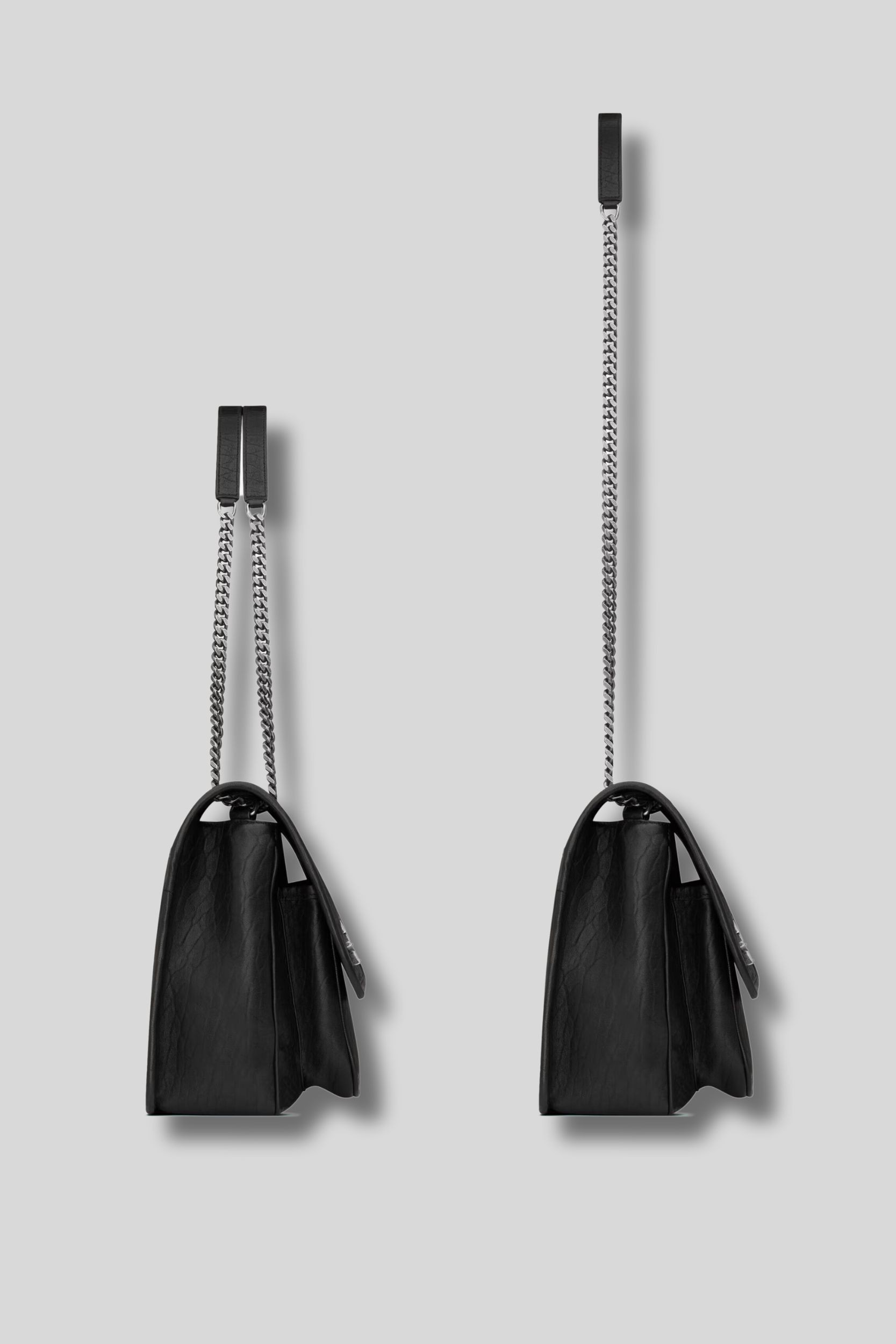 Orné du logo Cassandre, il est équipé d’une bandoulière chaîne coulissante, permettant un porté épaule ou croisé.