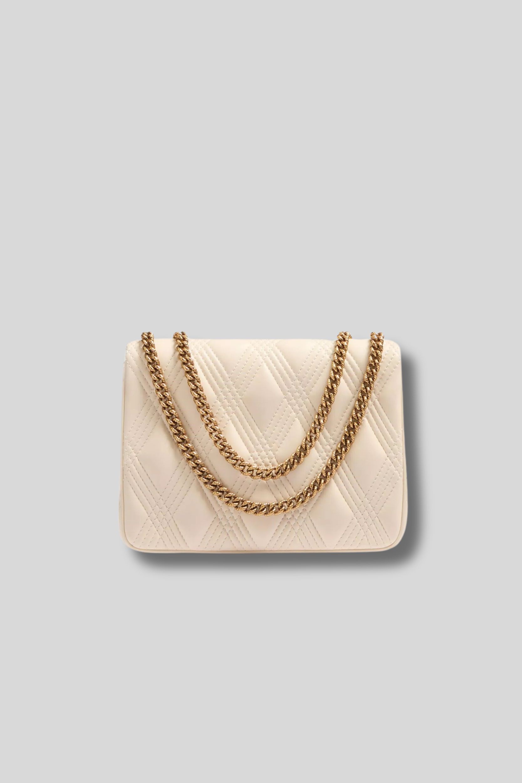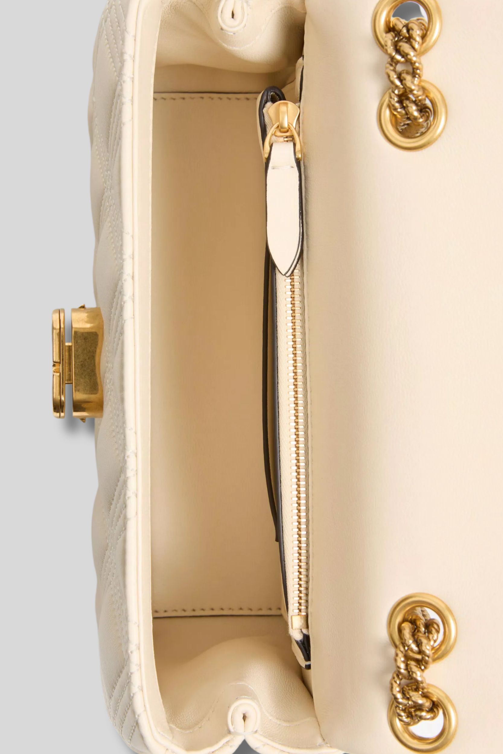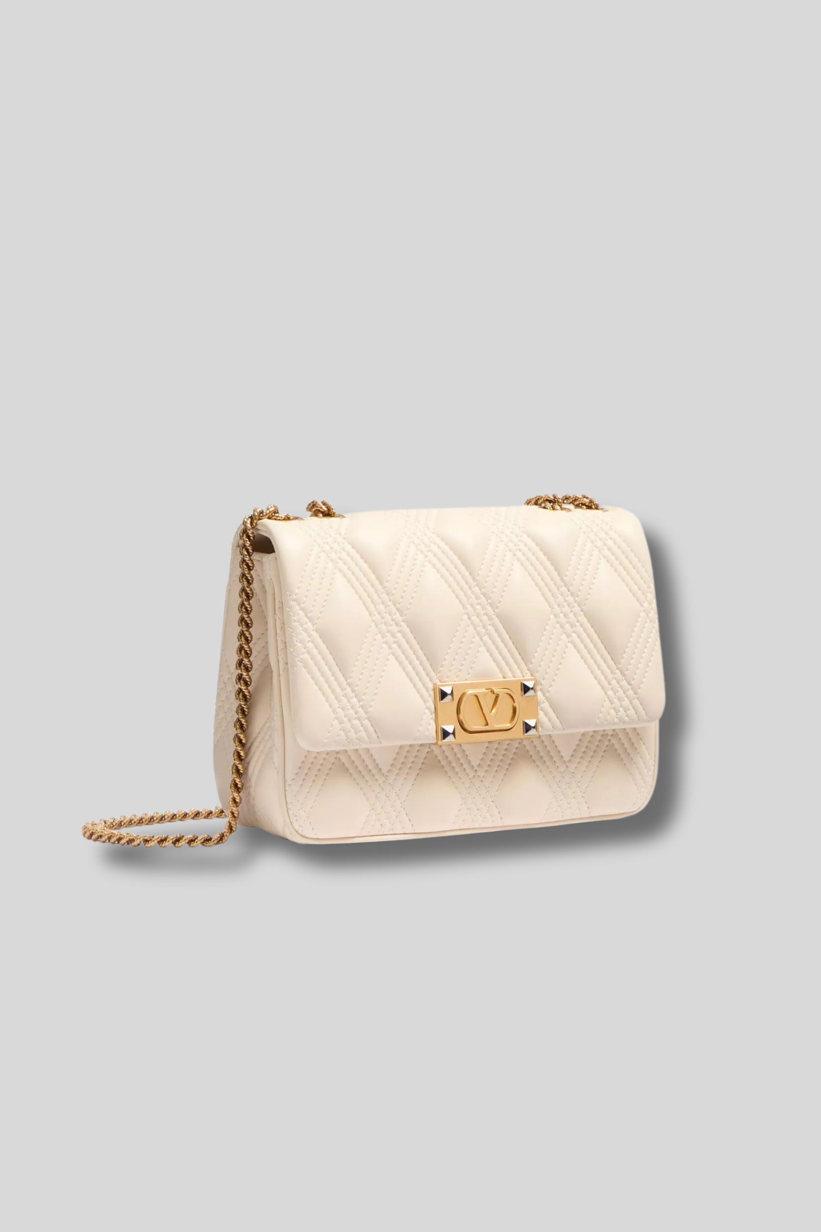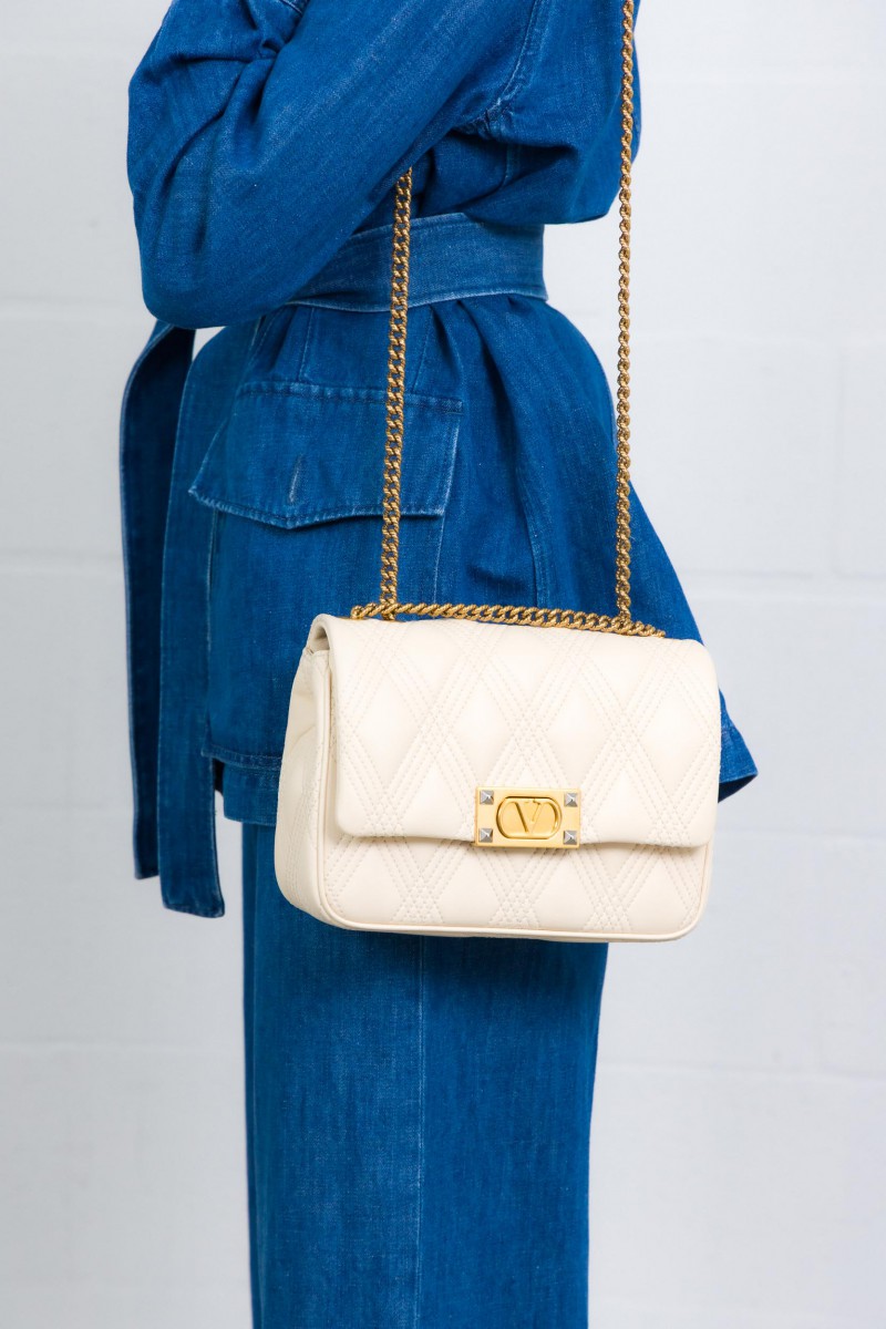 Ce sac moyen Quiltie 67 en cuir nappa avec chaîne dorée est signé Valentino Garavani. Celui-ci est confectionné dans un cuir matelassé et est détaillé de pièces en métal finition or vieilli. Ce produit possède un compartiment intérieur avec une poche zippée et peut se porter à l'épaule ou en bandoulière grâce à sa chaîne coulissante.