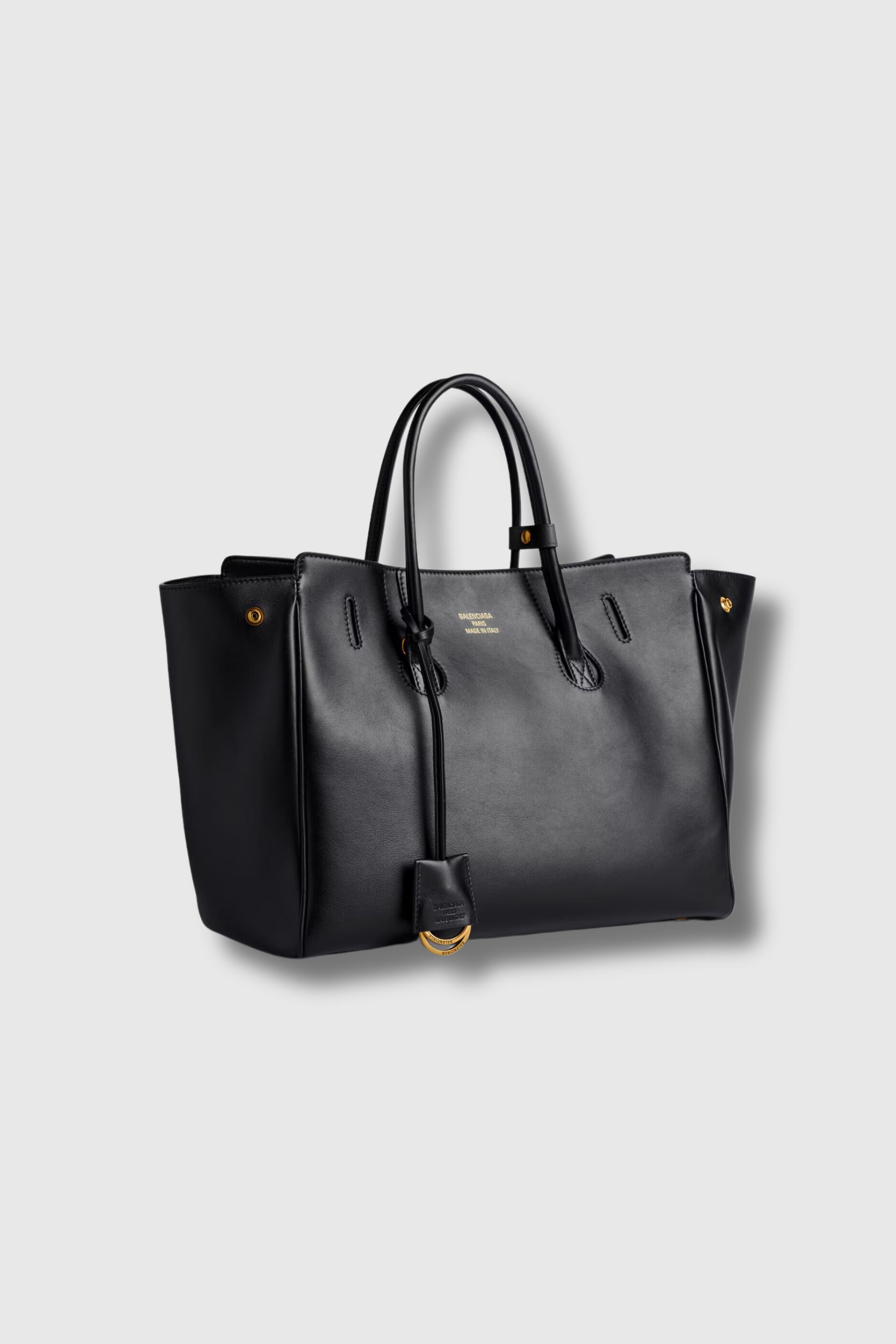 Ce sac Carry All Hampton Small en cuir de veau lisse est signé Balenciaga. Celui-ci présente le logo Balenciaga Paris embossé sur le devant, un porte-clé cloche amovible détaillé de deux anneaux fendus, des boutons pressions sur les côtés et un fermoir aimanté. Ce produit possède un compartiment principal, une poche intérieure zippée et 2 poches intérieures plates.