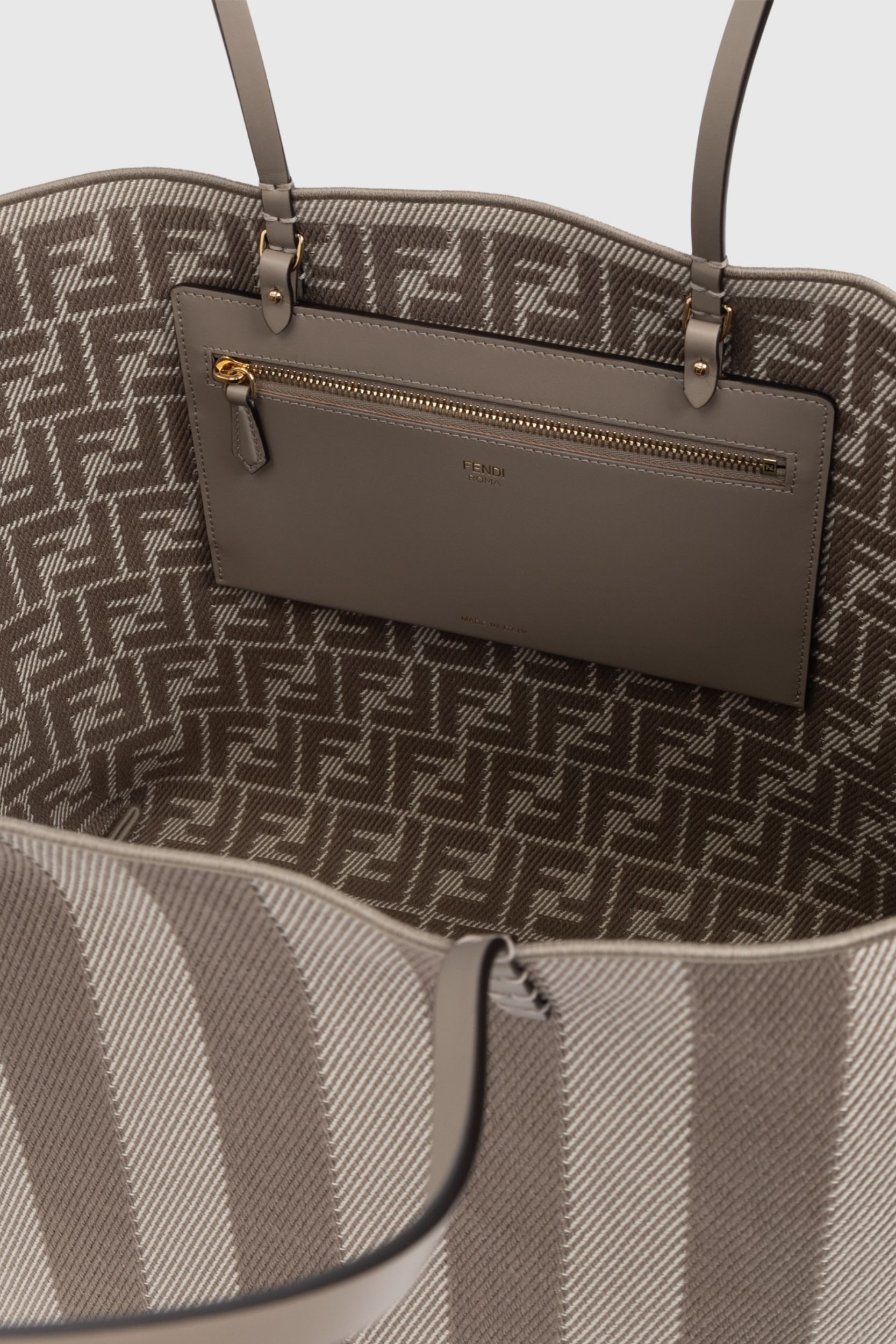 Ce sac shopping en tissu taupe est signé Fendi. Classique intemporel, il se distingue par son côté pratique, à la fois fourre-tout et élégant. Ce modèle réversible est conçu en jacquard, avec d’un côté un motif à rayures Pequin, et de l’autre un jacquard imprimé du logo FF avec un effet denim. Les poignées, en cuir de veau ton sur ton, permettent un porté épaule ou main.