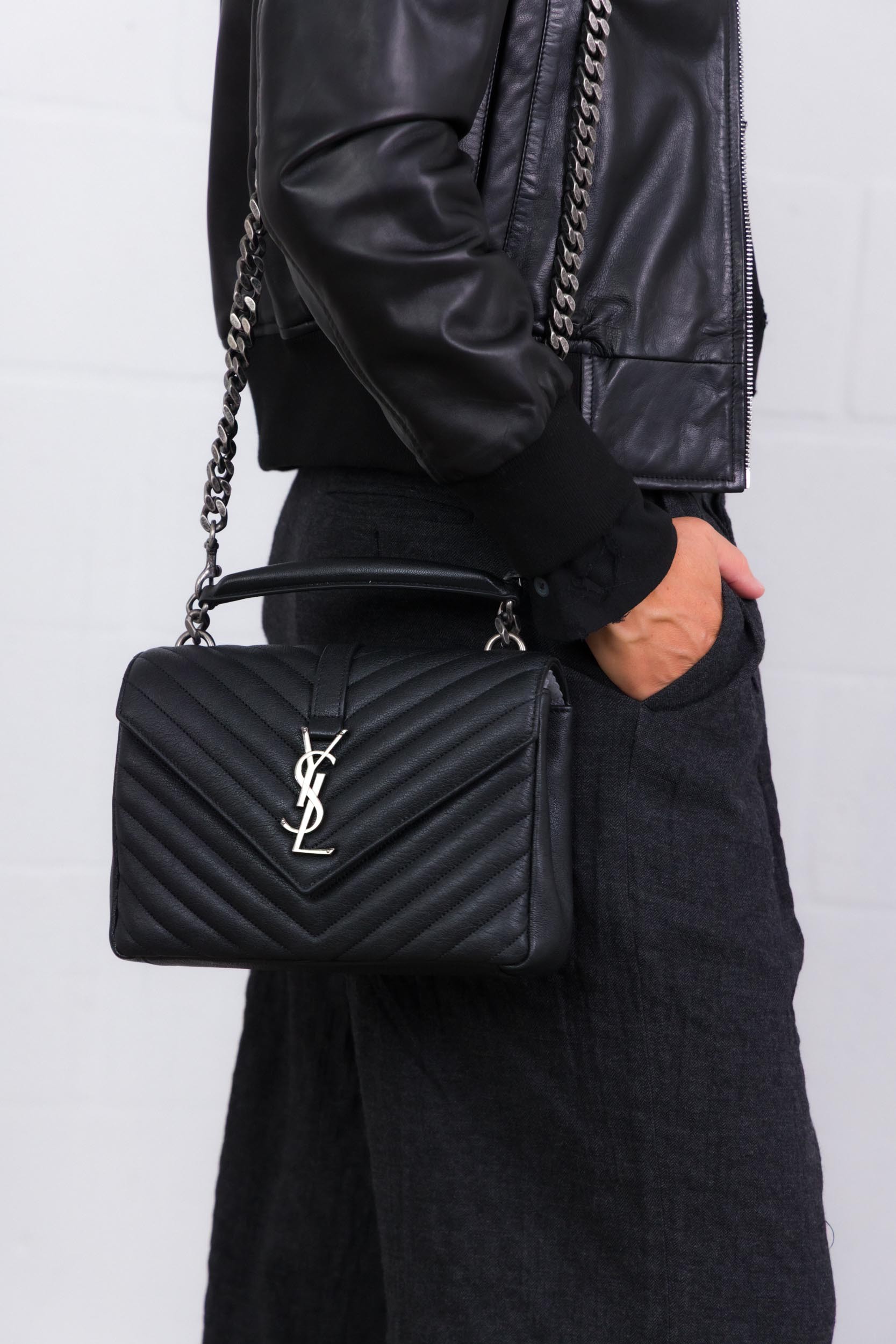Ce sac College medium cuir noir est signé Saint Laurent. Celui-ci est détaillé de l'iconique matelassage en chevrons et présente une poche intérieure zippée, une fente plaquée à l'arrière et un fermoir aimanté. Sa chaine est amovible.