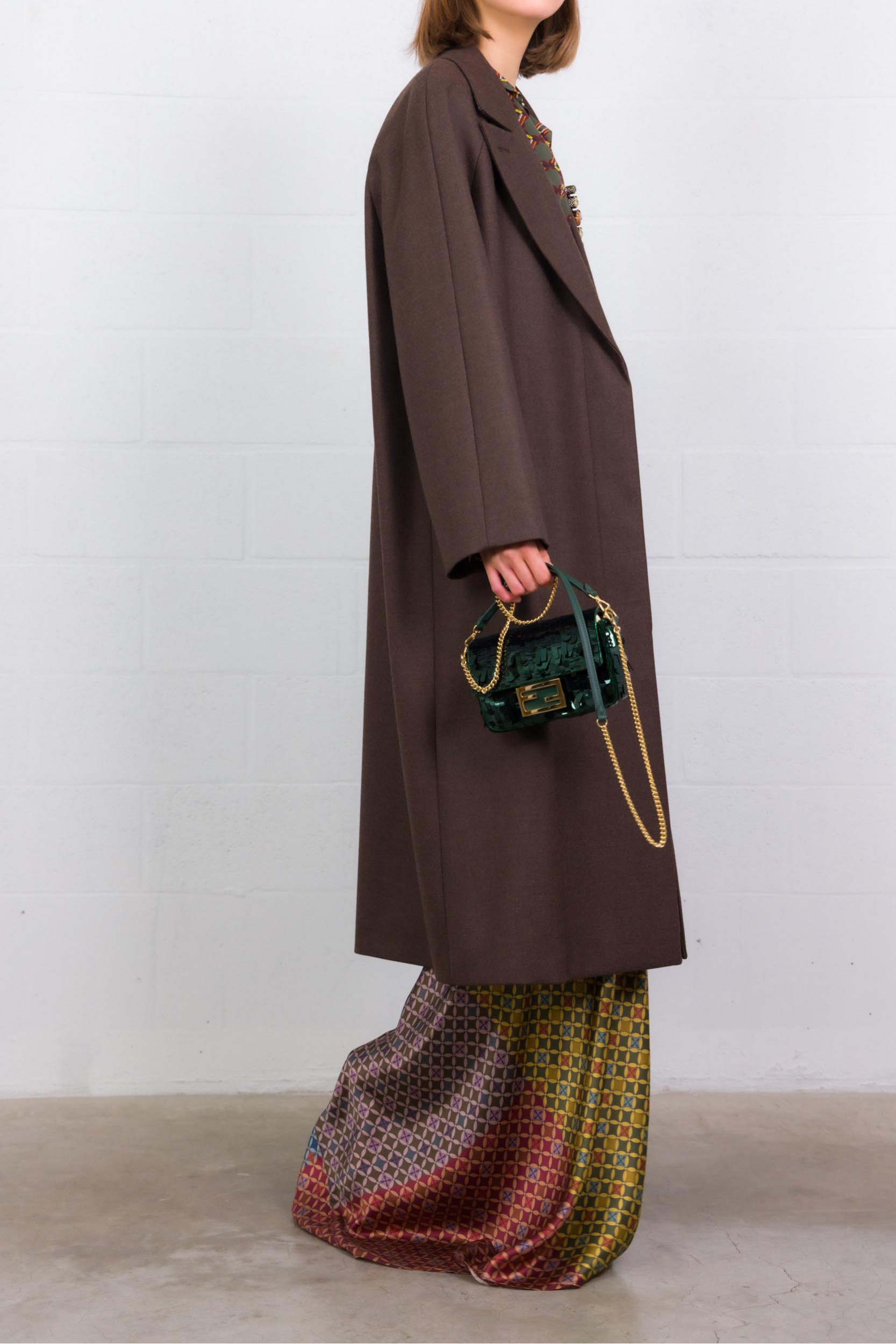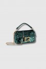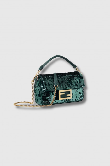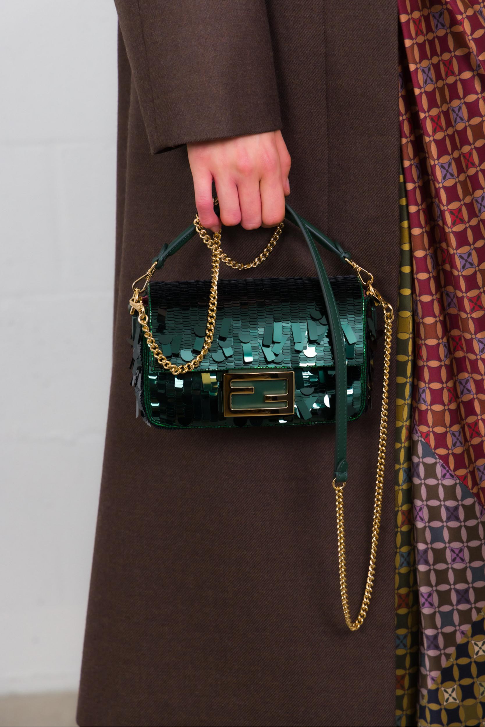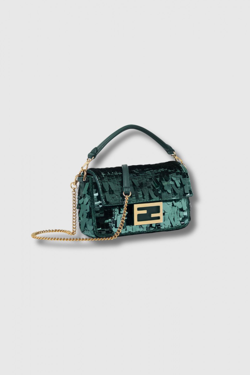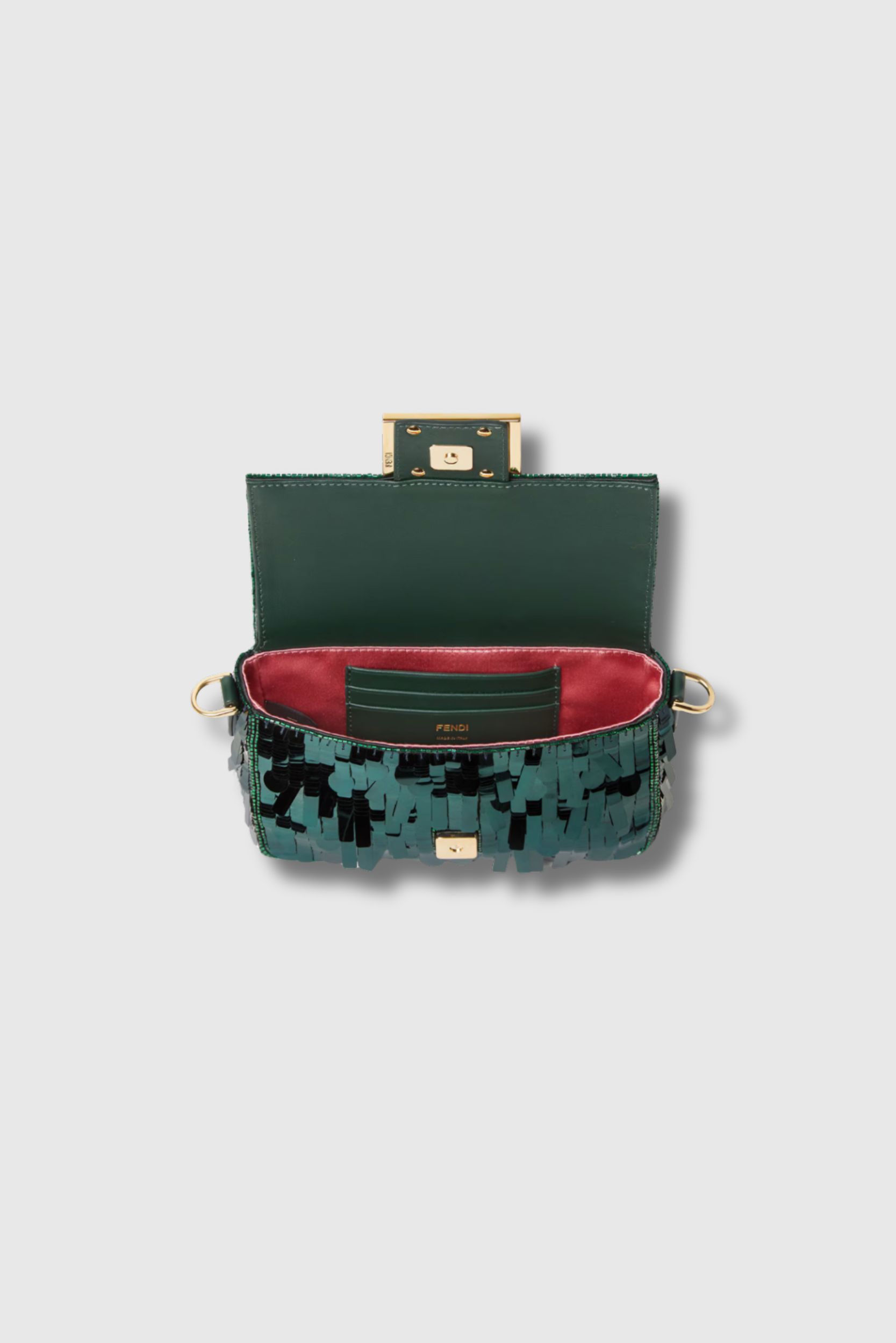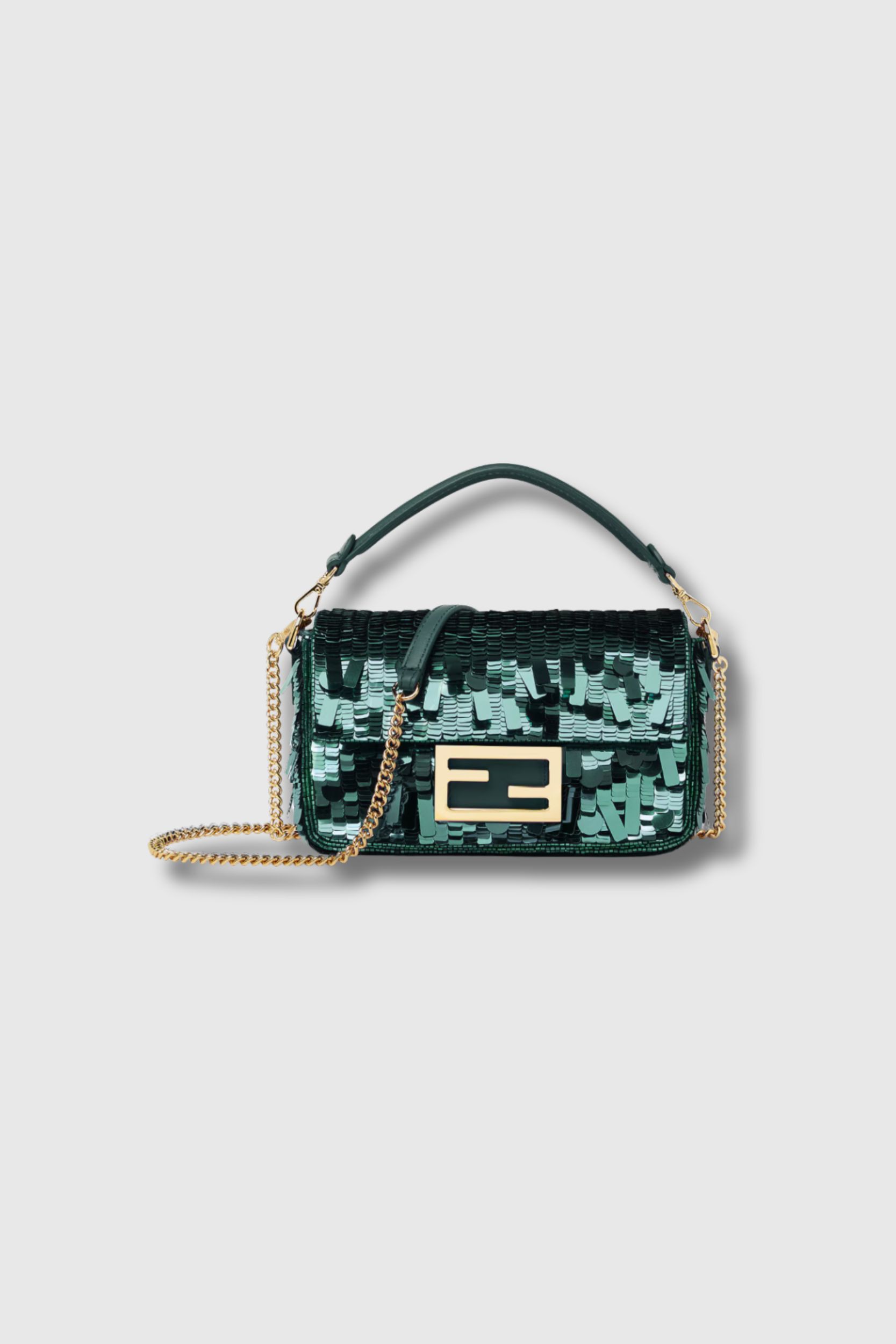 Ce sac Baguette small vert bouteille est signé Fendi. Icône de la Maison, il se distingue par une broderie réalisée à la main en sequins verts de formes et tailles variées, rehaussée de finitions en cuir de veau ton sur ton et du fermoir FF emblématique. Son rabat avant s’ouvre sur un intérieur doublé de satin rose, agrémenté d’une poche en cuir, tandis que les garnitures en métal doré soulignent son élégance. La poignée et la bandoulière chaîne, toutes deux amovibles, offrent plusieurs portés : à la main, à l’épaule ou en bandoulière. Compact mais fonctionnel, il peut accueillir un smartphone 6,7 pouces, un porte-cartes ou mini portefeuille, des clés et un rouge à lèvres.