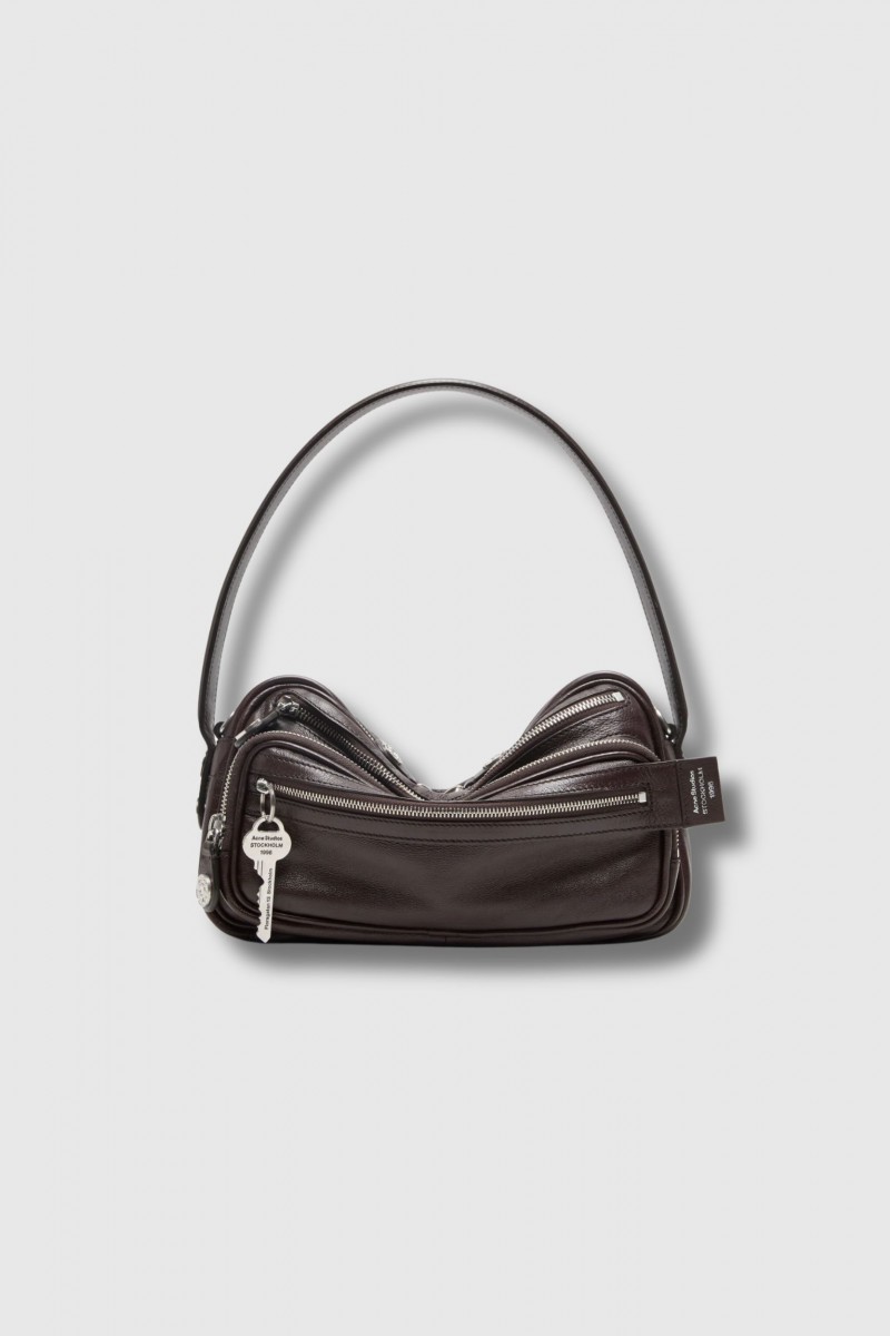 Ce sac Camero Party en cuir chocolat est signé Acne Studios. Confectionné en cuir imprimé croco, il se distingue par sa construction multipoche avec compartiments zippés. Il est agrémenté d’un porte-clés siglé, d’un bouton signature inspiré du denim et du logo Acne Studios 1996 embossé argenté. Doté d’une poignée tombante et d’une bandoulière ajustable, il allie praticité et style, avec des finitions métalliques argentées pour une allure contemporaine.