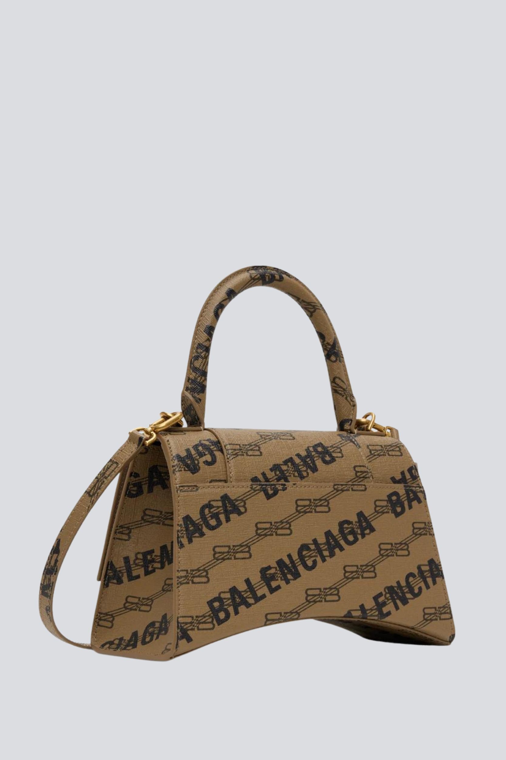 Ce sac Hourglass Small en cuir beige est signé Balenciaga. Il présente un imprimé logo all-over noir et un logo B en métal doré vieillit sur l'avant.