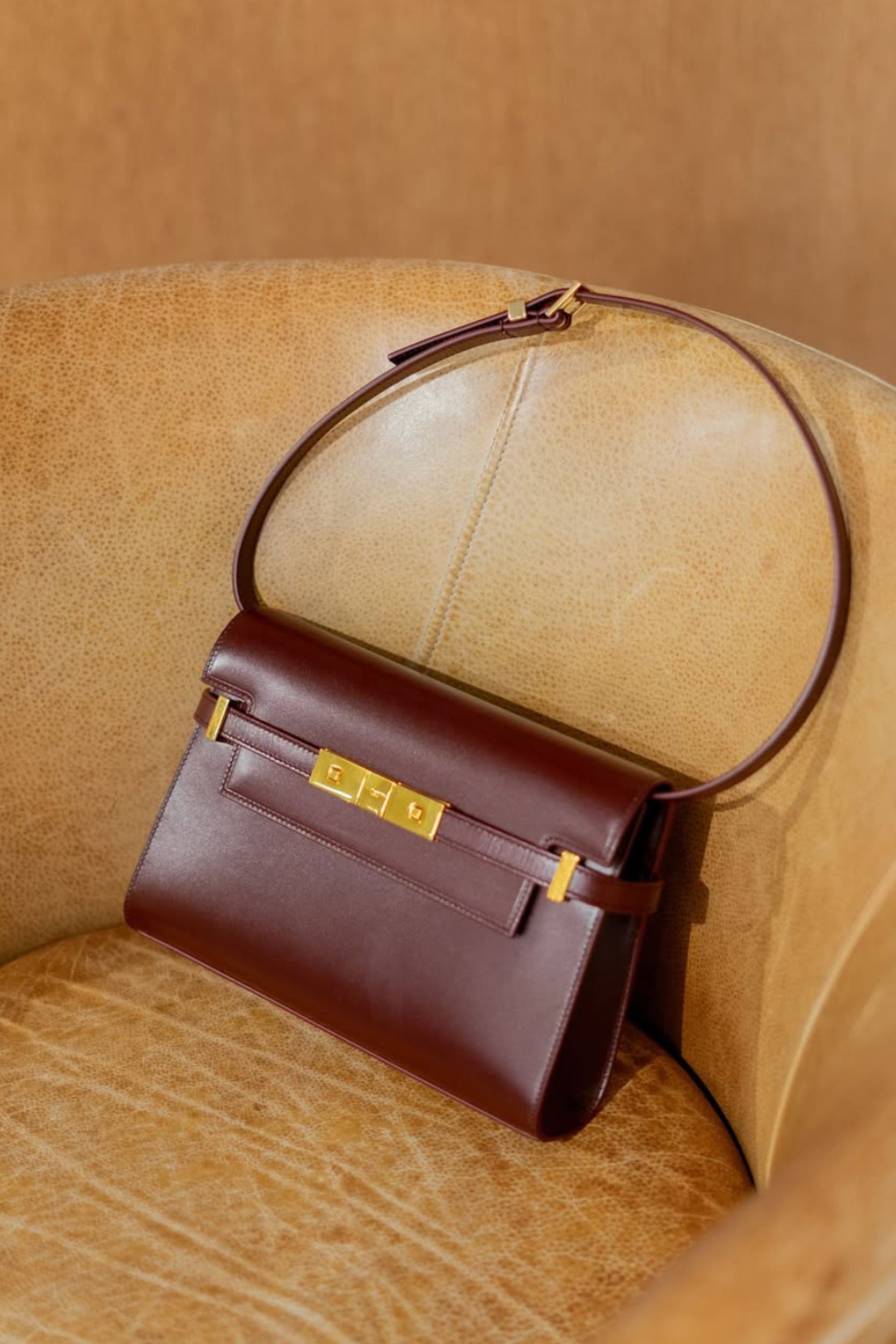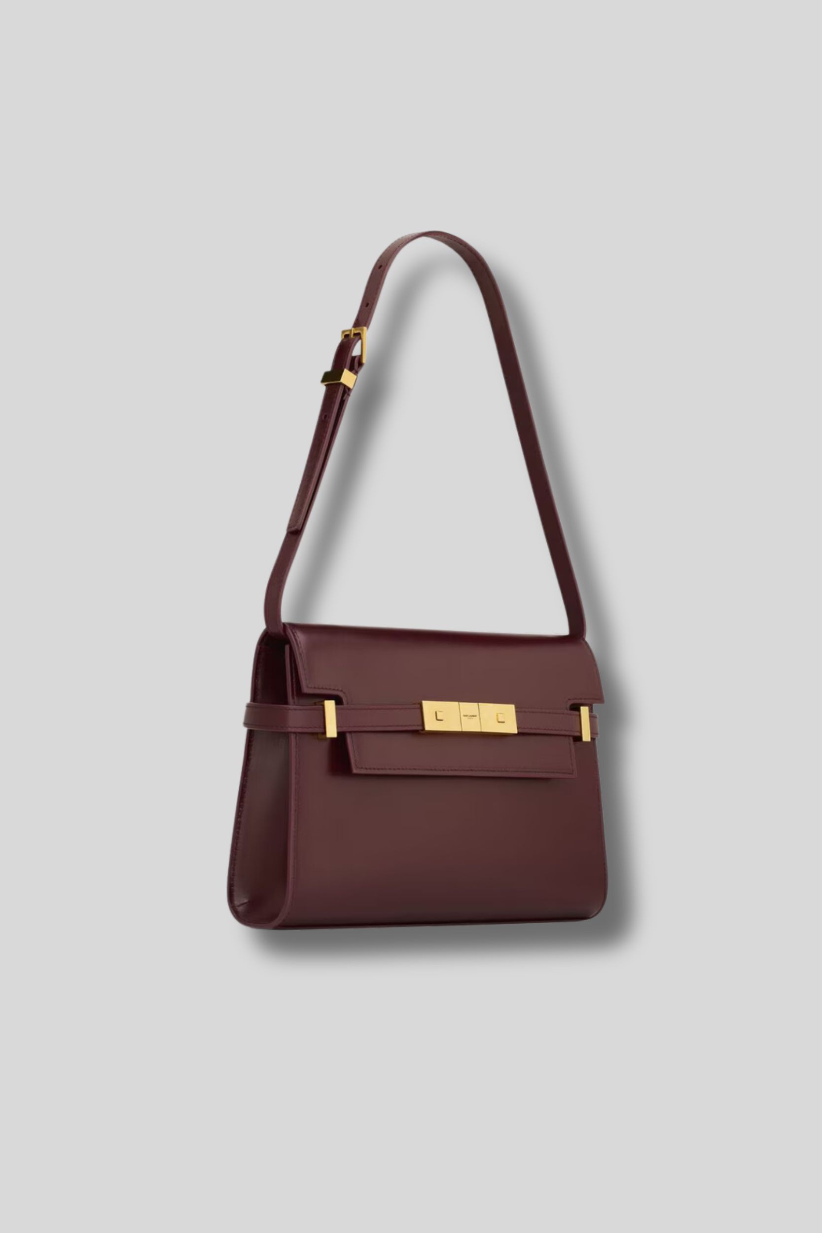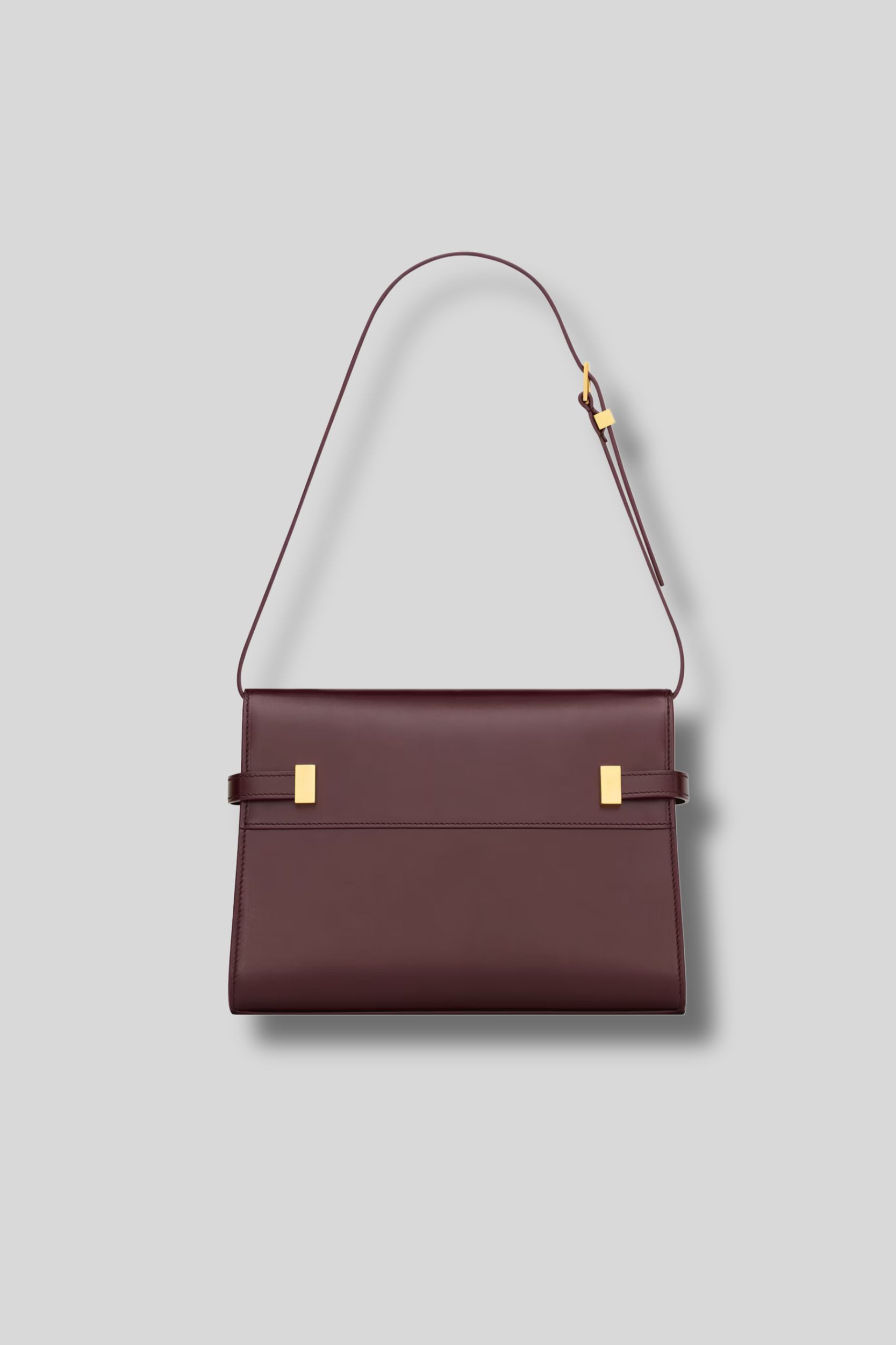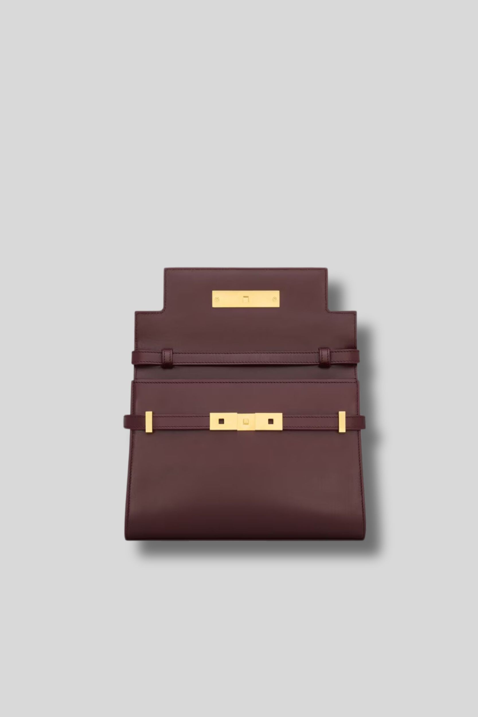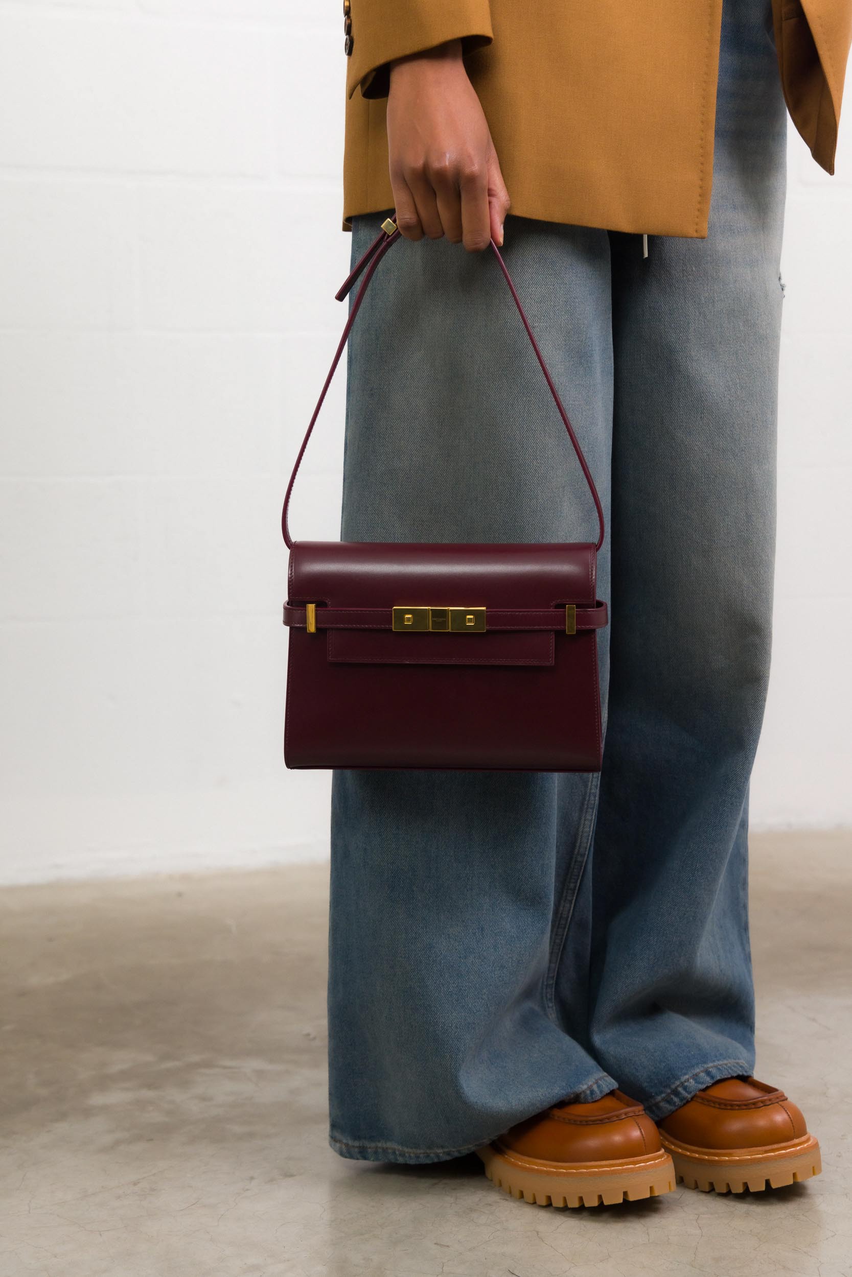 Ce sac Small Manhattan en cuir de veau rouge Hot Wine est signé Saint Laurent. Celui-ci est muni d'un petit rabat sur l'avant de pattes de compression sur les côtés. Cette pièce se porte à l'épaule. Ce sac possède un compartiment principal et une poche intérieure plaquée.