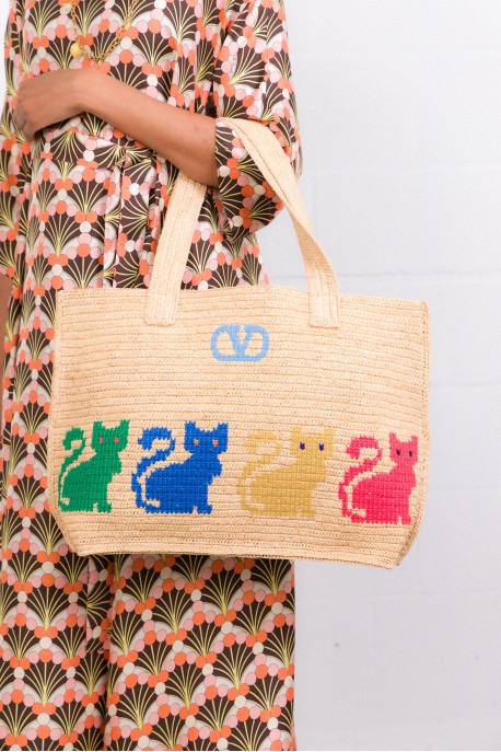 Ce sac cabas brodé chats beige signé Valentino Garavani allie fantaisie et élégance artisanale. Confectionné en raphia naturel, il est orné d’une broderie en coton multicolore représentant des chats, pour une touche ludique et originale. Le VLogo Signature brodé apporte la signature iconique de la maison, faisant de ce cabas une pièce à la fois pratique, chic et pleine de caractère.