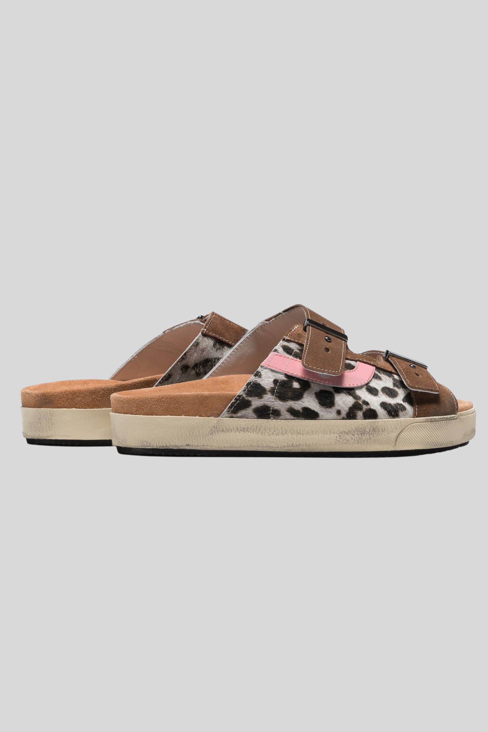 Cette sandale Sundl en cuir imprimé léopard est signée Hidnander. Elle présente un look décontracté "silp-on" avec une touche de grunge. Elle est réalisée en cuir et en daim et est dotée d'une boucle métallique, d'une semelle intermédiaire en mousse EVA et d'une semelle extérieure en caoutchouc.