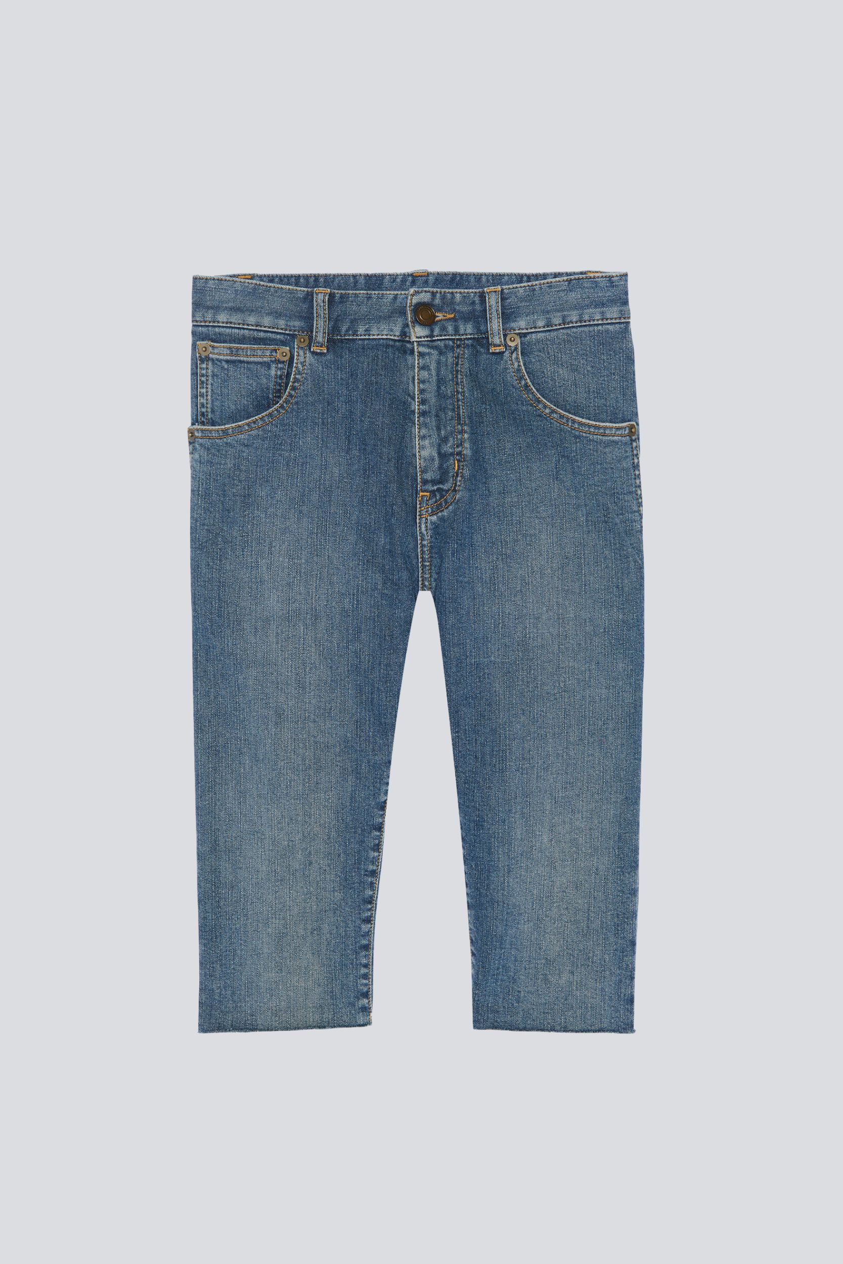 Bermuda long à bords bruts, muni de cinq poches et d'une fermeture zippée et deboutonnée.