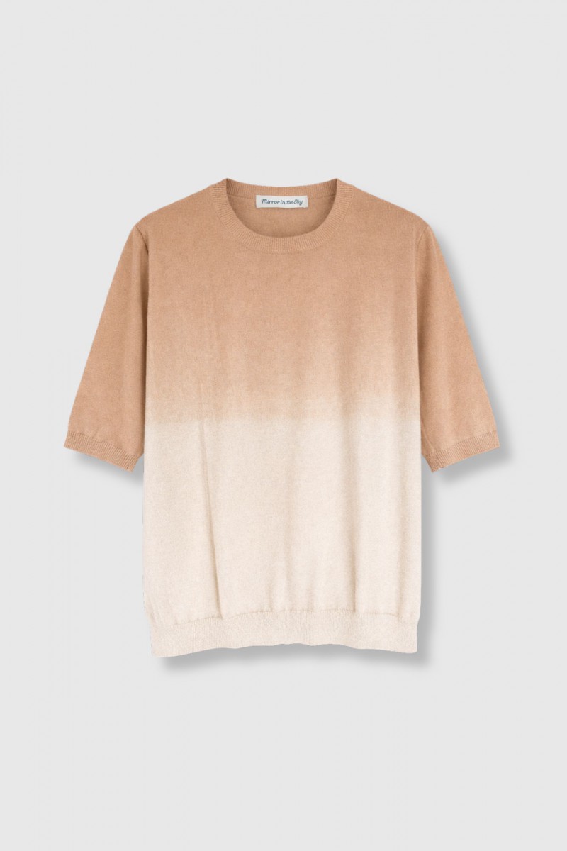 Ce t-shirt dégradé en cachemire et coton beige signé Mirror In The Sky allie confort et raffinement. Confectionné dans un mélange doux et léger, il présente une coupe droite, un col rond et des manches courtes, pour un tombé fluide et élégant. Le dégradé de bleu apporte une touche graphique subtile, idéale pour enrichir des looks casual-chic ou sophistiqués.