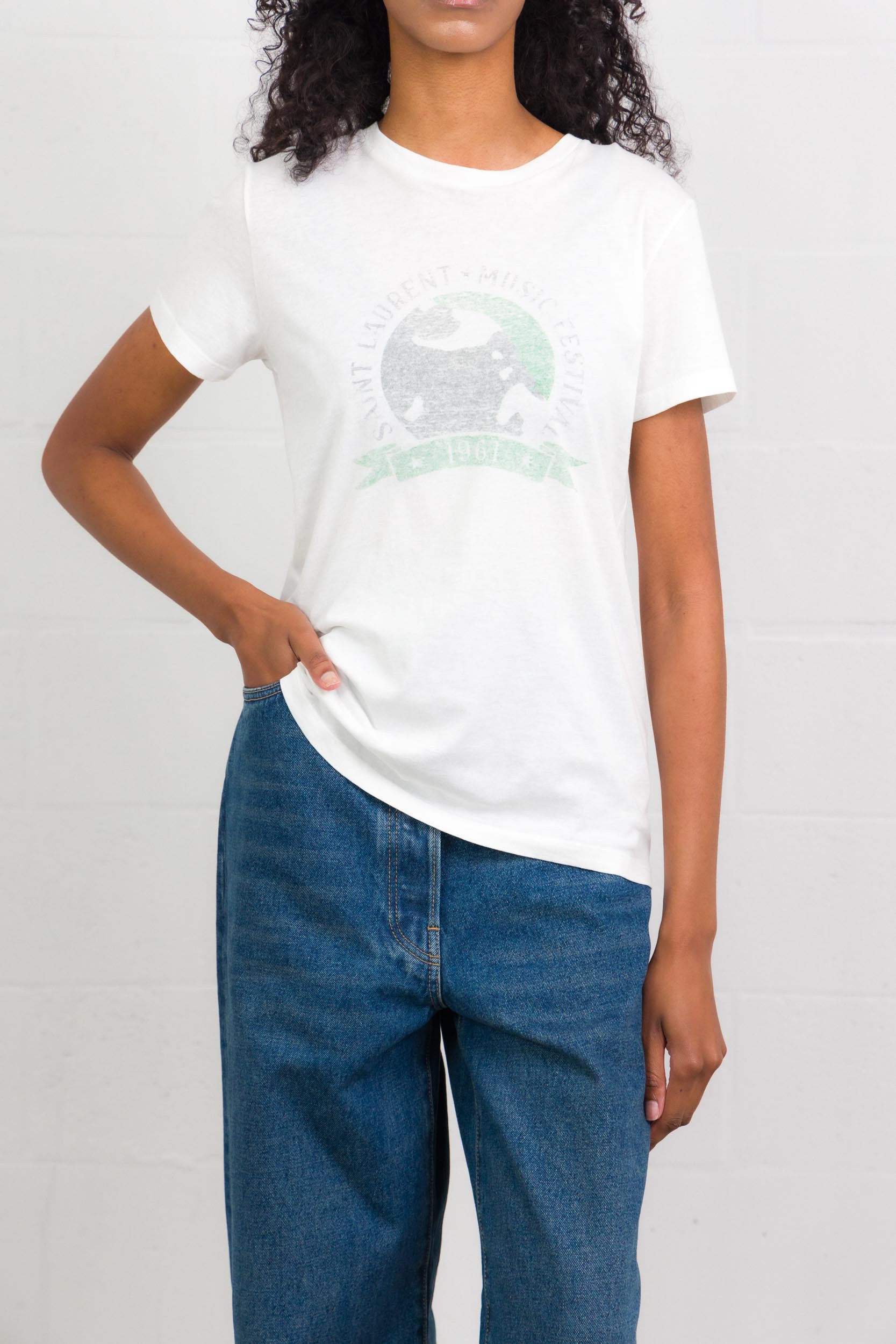 Ce t-shirt en coton Music Festival blanc et vert est signé Saint Laurent. Celui-ci possède un col rond, des manches courtes et un imprimé 1961 SAINT LAURENT MUSIC FESTIVAL délavé sur le devant