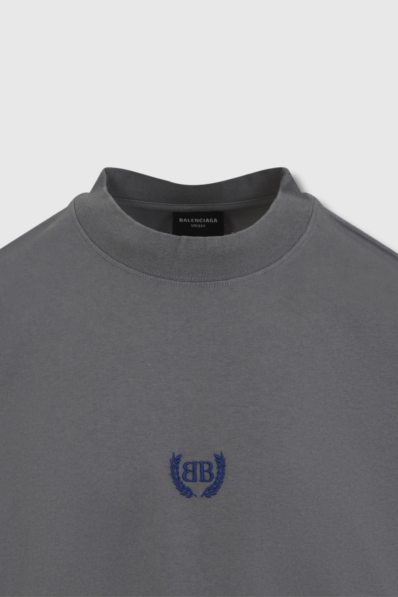 Ce t-shirt Laurel Classic gris est signé Balenciaga. Celui-ci présente un col rond, des manches courtes, un artwork brodé sur le devant et une coupe ample.