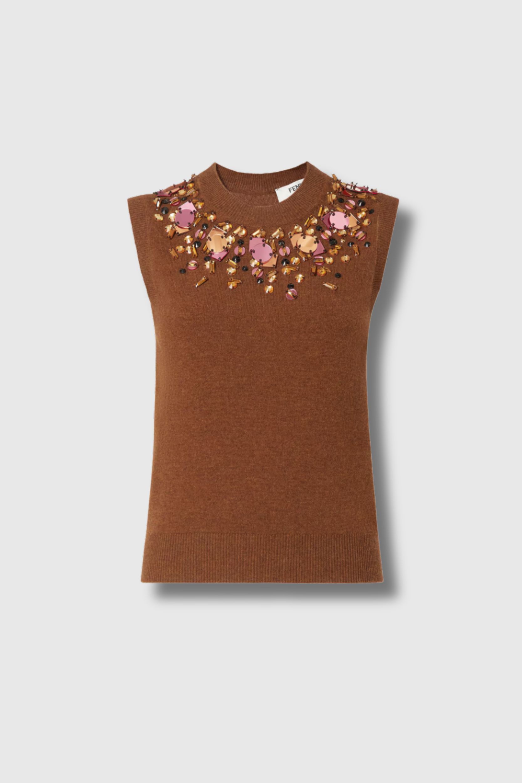 Ce top en cachemire brodé ocre est signé Fendi. Confectionné en laine et cachemire couleur rouille, il adopte une coupe classique à encolure ronde avec bords finement côtelés. La pièce se distingue par une broderie en relief raffinée, composée de paillettes, de micro perles et d’applications miroir effet sculpture, jouant sur des nuances contrastées. Un modèle élégant et précieux qui conjugue confort et sophistication artisanale.