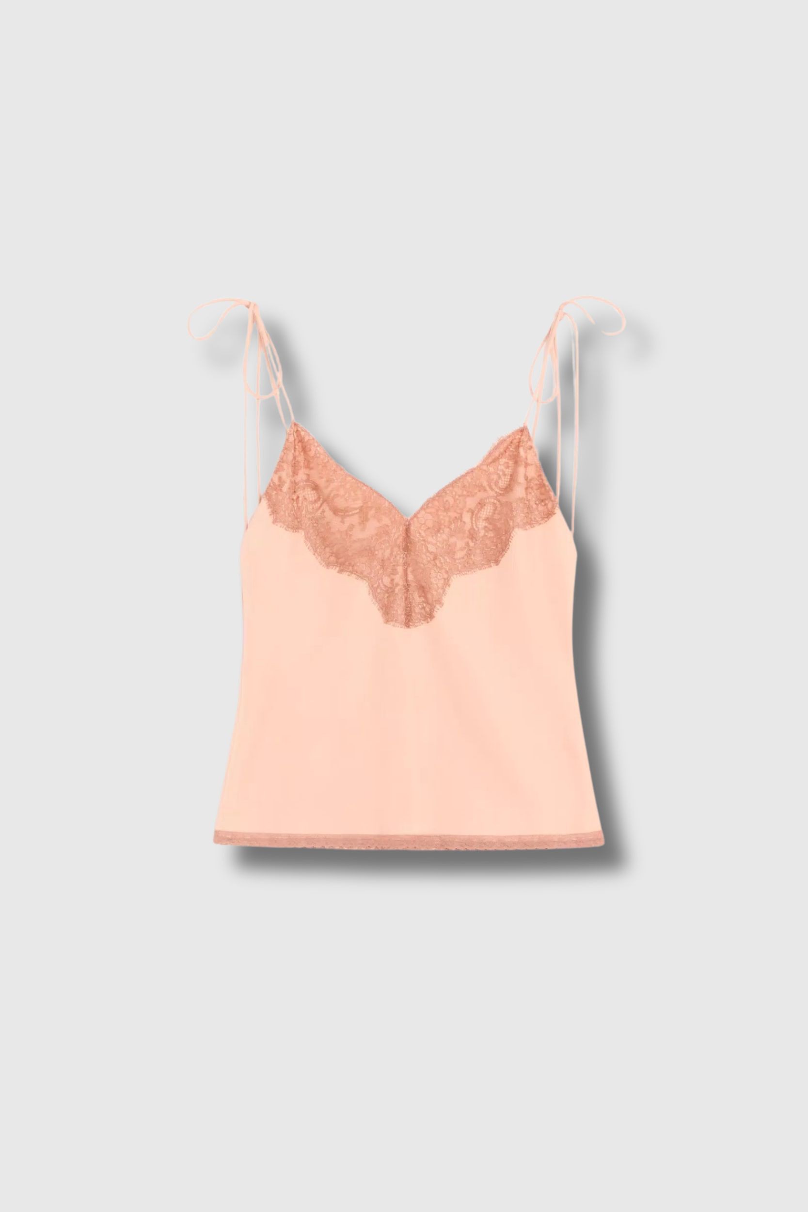 Ce top en crêpe de Chine rose signé Valentino Garavani allie délicatesse et féminité. Orné de dentelle raffinée, il dévoile une silhouette élégante et légère. Sa fermeture au dos par boutons recouverts ajoute une touche couture subtile, pour un style romantique et sophistiqué en toute simplicité.
