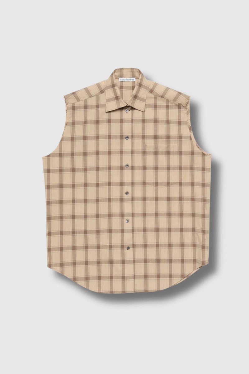 Ce top sans manches à carreaux en laine fine beige est signé Acne Studios. Il se présente comme une chemise boutonnée à col classique, confectionnée en laine légère ornée d’un motif à carreaux saisonnier. Doté d’une poche poitrine, ce modèle adopte une coupe ample et une longueur aux hanches, offrant une silhouette décontractée et moderne. Sans manches, il allie élégance et légèreté pour un style à la fois raffiné et facile à porter.